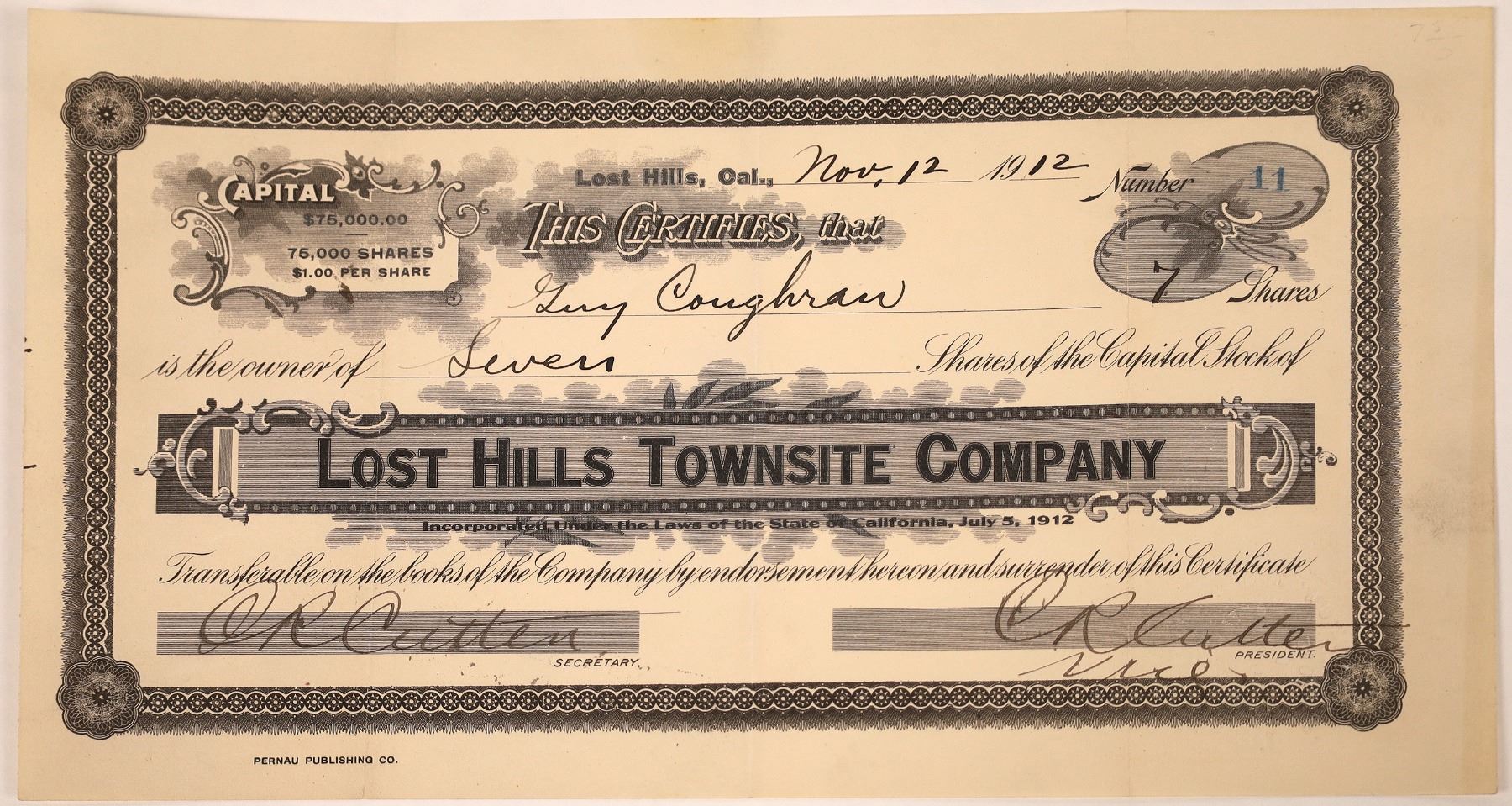 Inc. in California, 1912. Dateline Lose Hills, Cal. Low cert. number 11, issued for 7 shares to Gary Coughran on Nov. 12, 1912. Signed by CR Cuttens as both secretary and vice president. Not cancelled. Black border and print. Pernau Publishing Co. Folds. 5.75 x 10.25" Lost Hills is a cattle town in Kern County in Central California. Charles R. Cuttens founded the town of Cuttens, also in Kern County, and served as its postmaster until relocating to Lost Hills.