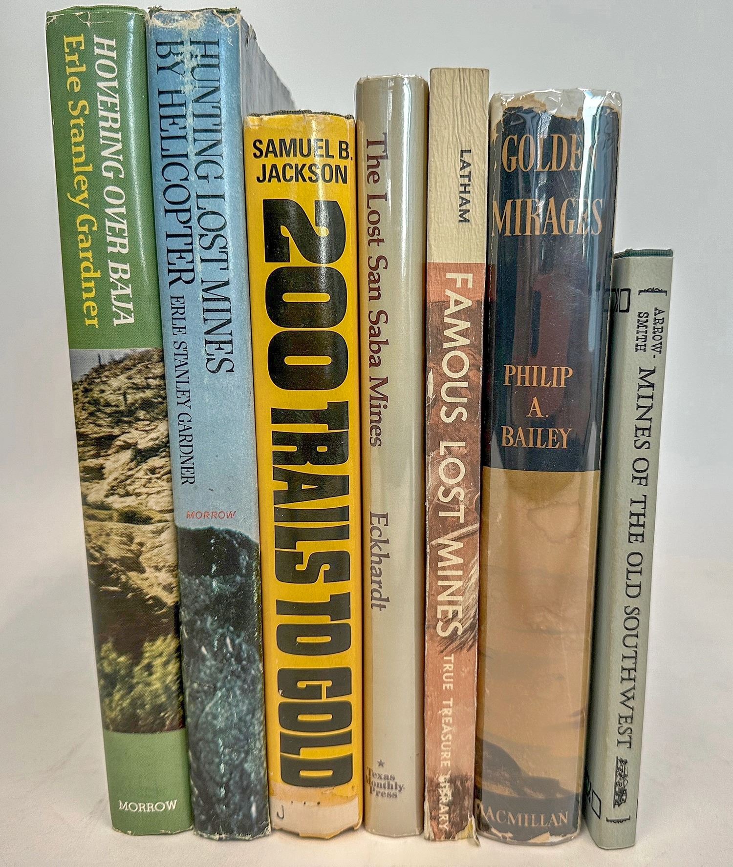 A collection of books on lost mines, which includes: 1. 200 Trails to Gold: A guide to promising old mines and hidden lodes throughout the west, by Samual B. Jackson. Doubleday & Company. 1976. 2. The Lost Sansaba Mines: One man's search for ancient treasure in the hills of Texas, by C.F. Eckhardt. Texas Monthly Press. 1982.3. Famous Lost Mines of the Old West, by John H. Latham (ed). True Treasure. 1971.4. Mines of the Old Southwest, by Rex Arrowsmith. 1st ed. 1963. AUTOGRAPHED by author. 5. Golden Mirages, by Philip A. Bailey. Macmillan Company. 1940. 6. Hovering Over Baja, by Erle Stanley Gardner. William Morrow and Company. 1961. 7. Hunting Lost Mines by Helicopter: Adventures in the American Desert, by Erle Stanley Gardner. William Morrow and Company. 1965. Franklin Collection. Franklin Collection