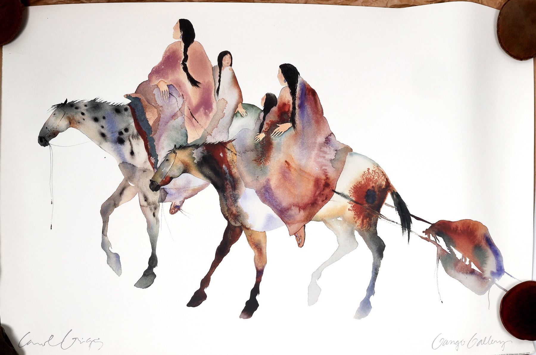 Choice poster by Carol Griggs 1992. Colorful, 4 Native Americans riding 2 horses. Heavy paper. 22x39".