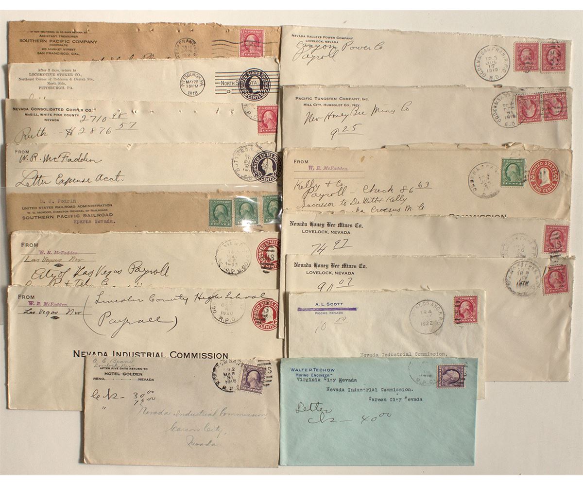 Five Ogden & San Francisco. One Ogden & Caliente. One Caliente & Barstow. Two Sparks & San Francisco. One Butte & Salt Lake City. Five others. Cancels are generally weak. Many corner advertising covers.