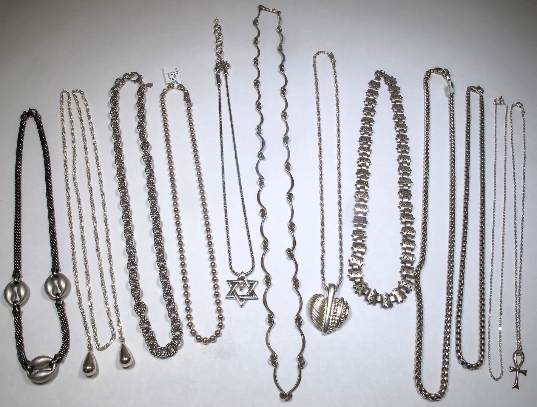 Group of silver chains: 1) thin silver 19"; twisted silver with heavy sterling tear drops on ends--37"; 2) heavy twisted loop chain--19"; 3) silver ball/bead chain--18"; 4) thin silver chain--18" with ankh; 5) link silver-14"; 6) silver twisted chain with heart--18"; 7) silver chain—14” with Star of David and pearl; 8) flat curved silver chain—14”; 9) square box link chain--22"; 10) square link chain—19”. Also included: two fancy chains--18" each.