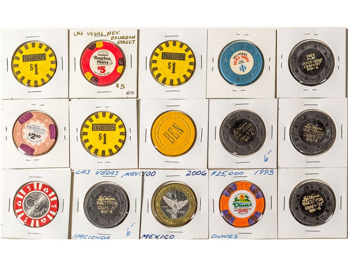 1) Mexico, bimetallic, silver center, 2006 $100. 2) Lake Tahoe, Horizon, $2.50 tri-color. 3) Reno, Prima Donna $1. Blue & White. 4) Las Vegas, Dunes, $10,000 five colors. 5) Las Vegas, Sahara, red, white and metallic center. 6) Yellow B E N $1.00. 7) Las Vegas, Bourbon Street, $5, four colors. 8-10) Reno, Harrah's, $1.00. 11-15) Las Vegas, Hacienda, brown, craps.