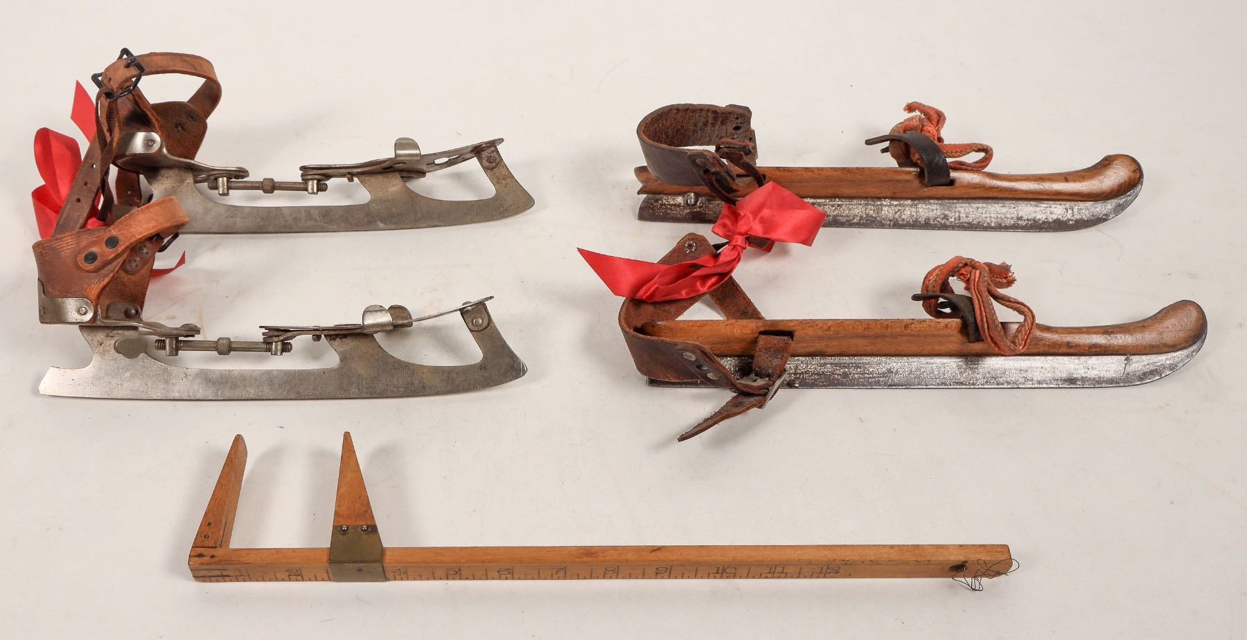 Lot of (2) pairs of antique ice skates, circa pre-1900 to 1920's. Lot also includes a vintage wooden foot-measuring device. First pair is wood single blade skates with leather and lace ties for insert of boots. (Think Hans Brinker) Second pair is more modern, with adjustable length curved foot bed, steel constructed by the Lincoln Hardware Co. Mand made in Torrington Connecticut. Model No. 57 1/2, stamped #9. Blades on this pair are conventional in shape, as opposed to the first pair. Leather straps at rear heel piece, with riveted shoe clamps at curved front piece. There is a cutout on the front foot plate pieces shaped like the Clubs suite of cards. See photos for details.