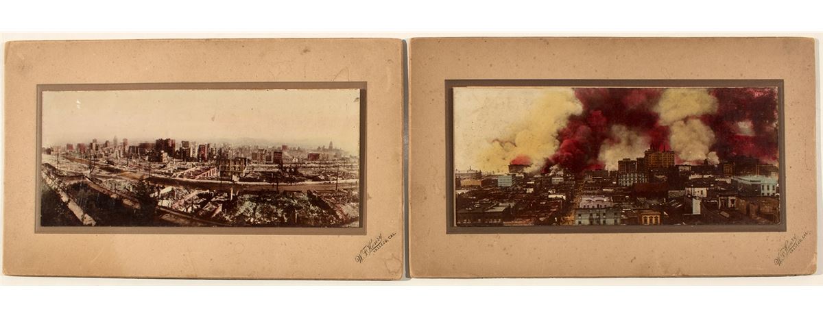 Two photographs of San Francisco. One showing earthquake damage and one showing city on fire. Photos are 18" x 4" and mounted on heavy cardstock with' W. F. Henry, Valleyjo, Cal.' printed on corner.