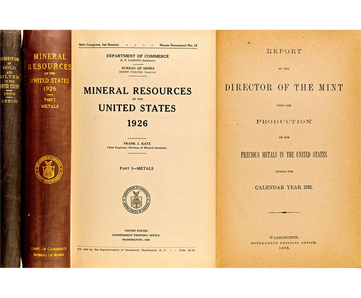Lot of 2 hardcover books. Mineral Resources of the United States 1926 and Report of the Director of the Mint upon Production of Precious Metals in the United States during the calendar years 1892. Produced in Washington by the Government Printing Office. The cover has slight wear on the edges. The bottom edges of the cover are frayed. Mineral Resources book lists all the minerals available in the United States. The second book is from 1892 and is a report on the production of precious metals in the U.S. that year. Hardcover has very little wear, spine is worn.
