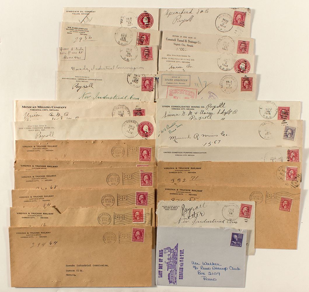 Interesting lot of 23. 1) Nice 1910 unclaimed Reno & Virginia City RPO from State Engineer in Carson City. 2) Thirteen Reno & Va. City RMS with Comstock Mines like Mexican, Spearhead, United, Comstock Tunnel & Drainage, and Con Virginia. 3) One last day of service. 4) Eight Virginia & Truckee Railway corner advertising covers postmarked Carson City.