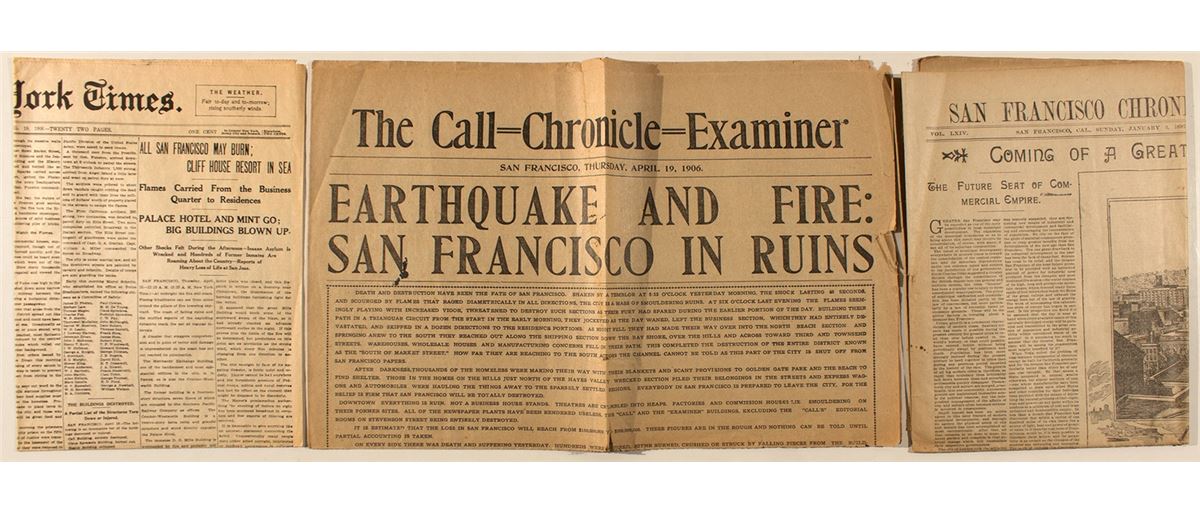 2) The Call=Chronicle=Examiner, April 19, 1906. Headline: "Earthquake and Fire: San Francisco in Ruins"