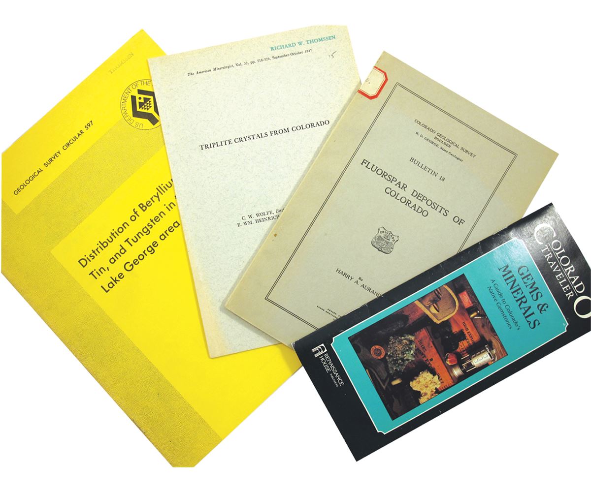 1) Gems & Minerals. 2) "Fluorspar Deposts of Colorado" 3) "Triplite Crystals from Colorado". 4) "Distribution of Beryllium Tin, and Tungsten in the Lake George area, Colorado."