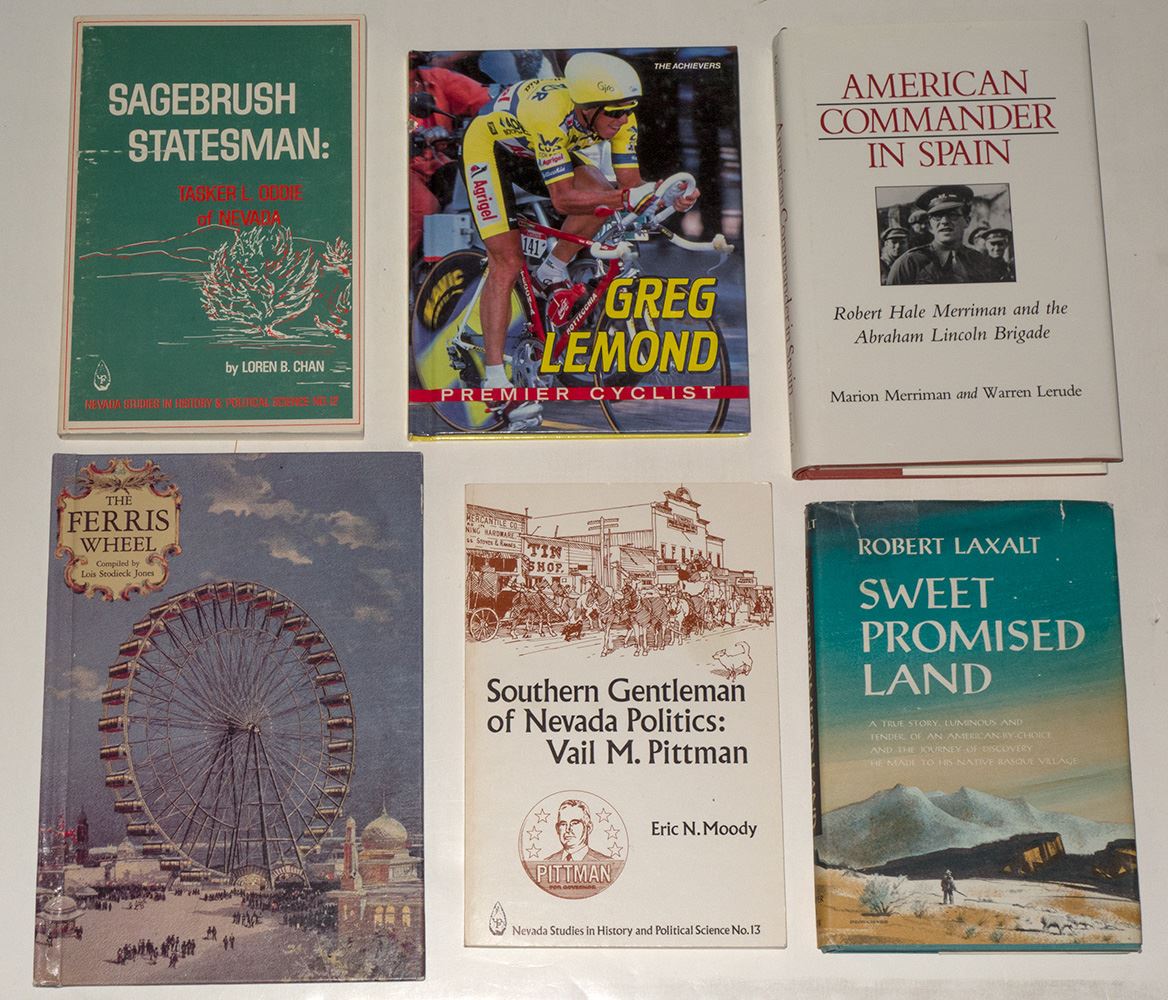 Six books about people in Nevada. 1) "American Commander in Spain" by Merriman and Lerude. About Robert Merriman. AUTOGRAPHED by both. Hardcover. Dust Jacket. 2)"Sweet Promised Land" by Robert Laxalt. About his father Dominique. 1977. With dust jacket (taped). 3) "Sagebrush Statesman" by Chan. Tasker Oddie. 4) "Southern Gentleman in Nevada Politics: Vail Pittman" by Moody. 5) "The Ferris Wheel" by Jones. Hard cover. 6) "Greg Lamond, Premier Cyclist" by Porter. Hard cover. Young adult.