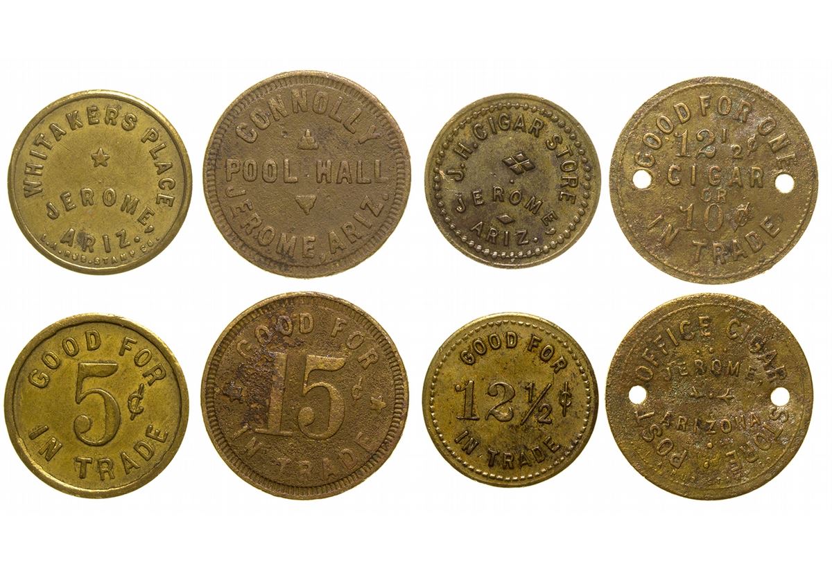 1) Obv.: Post Office Cigar Store Jerome / Arizona; rev.: Good For One / 12 1/2 c / cigar / or / 10c / In Trade; rd. two holes; 2) Obv.: J. H. Cigar Store / Jerome / Ariz.; rev.: good for / 12 1/2c / In Trade; 3) Obv.: Whitakers Place / Jerome, / Ariz.; rev.: Good For / 5c / In Trade; 4) Obv.: Connolly / Pool Hall / Jerome, Ariz.; rev.: Good For / 15c / In Trade.
