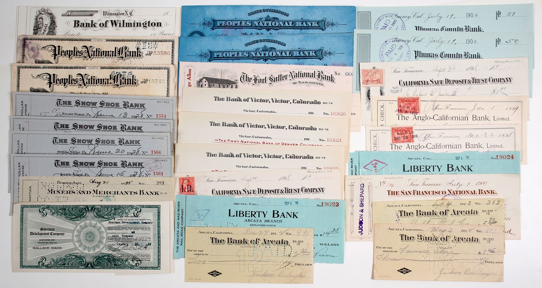 Approximately 25 checks, some unissued, some pictorial. Banks include Fort Sutter National Bank, Bank of Victor Colorado, Bank of Wilmington North Carolina, Snow Shoe Bank, and more. Date: 1891-28 Location: HWAC# 64038
