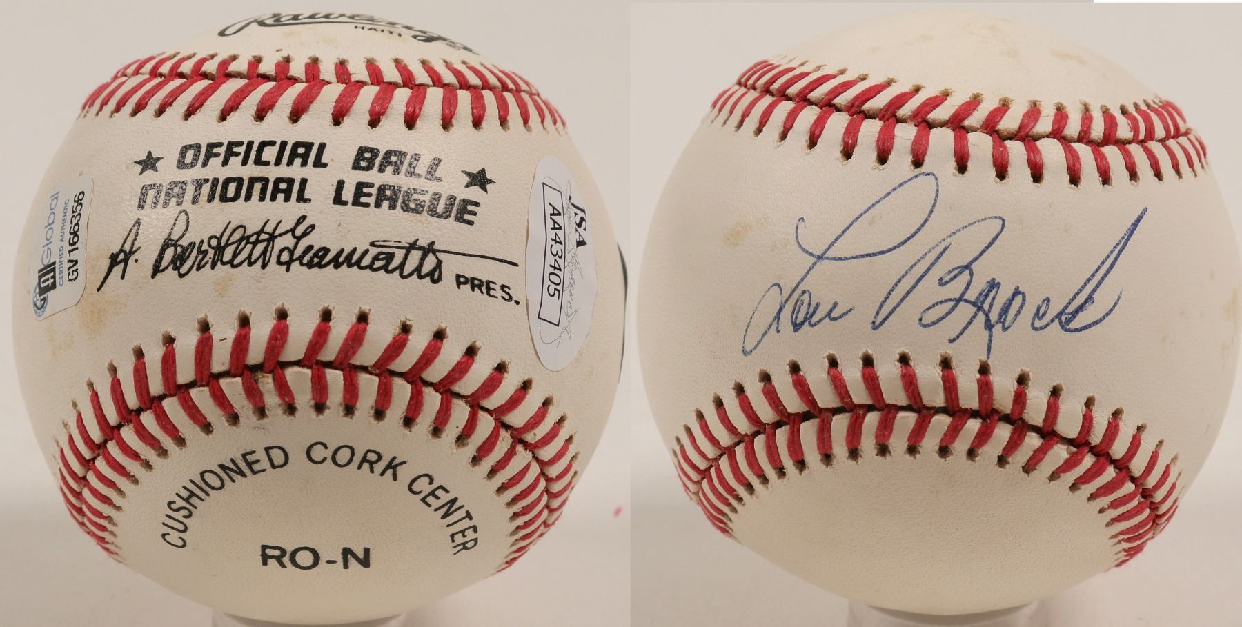This baseball is signed by Lou Brock. Ultra Pro display case D001861 JSA #AA43405.