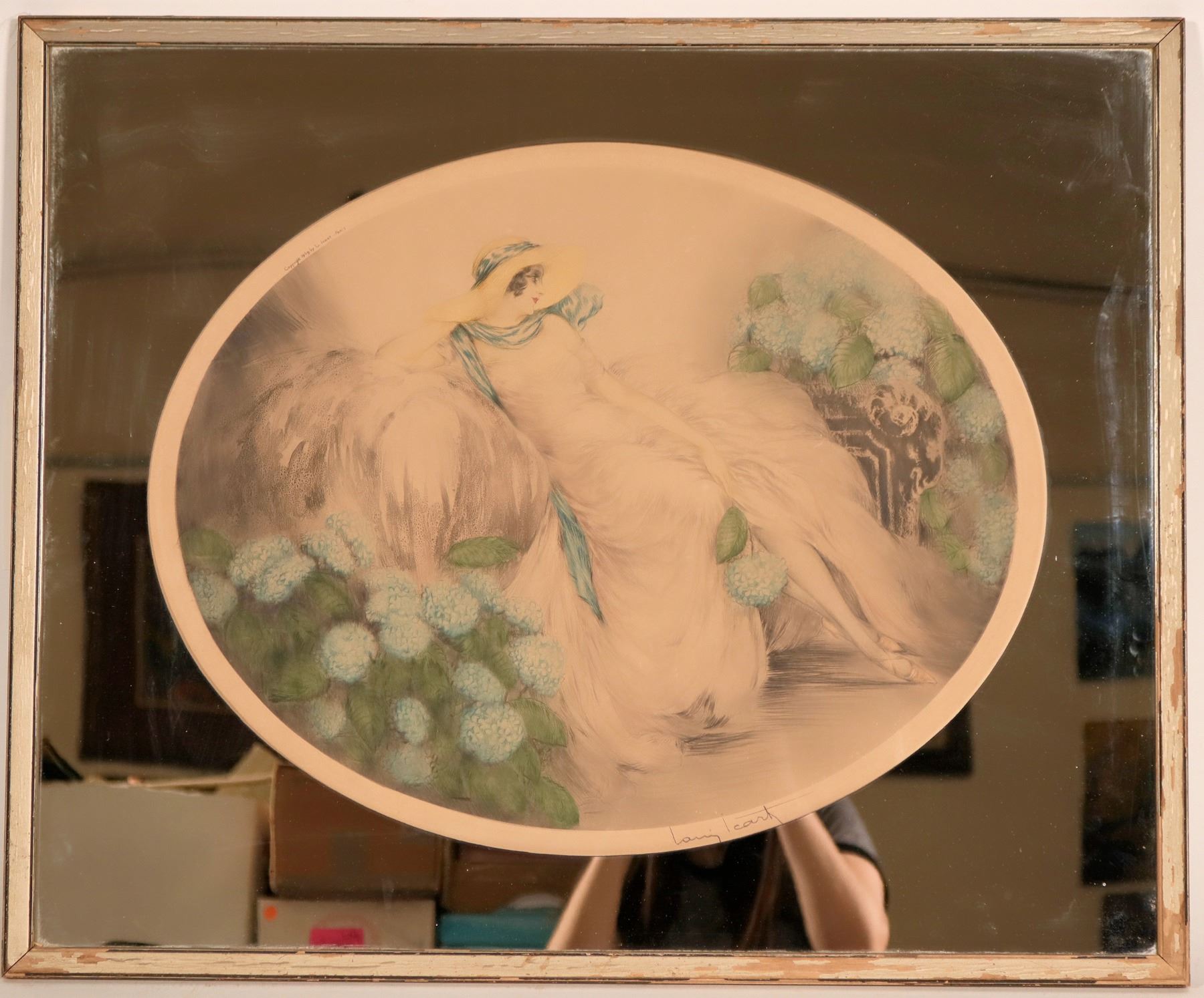 Classic Example from French, Art-Deco Period. Louis Icart artwork, titled Hortense with Hydrangeas. Autographed Etching Printed With Colors of beautiful French Lady resting on sofa with blue flowers. There is no number on this print but the paper is embossed with the "Icart Windmill" blind stamp on the bottom left with no edition notation. Copyright notation: "Copyright 1929 by L. Icart - Paris" appears at the top left, indicating this is an original print, not a reproduction. Original signature of artist in pencil on bottom right. Artwork measures approximately 16" x 20", frame measures 23" x 28". Matting is mirrored. Metallic colored paint is peeling from wood frame, which appears to be c1950-1960 from the style. Paper on reverse is mostly missing, but it is not clear if the piece was ever removed from the frame. The paper has some natural toning consistent with age, but otherwise this piece appears to be in excellent condition, preserved under glass. Louis Icart was born in Toulouse, France in 1888 and moved to Paris in 1907 where he lived and worked until his death in 1950. Icart began drawing in his childhood and went on to study painting, drawing and printmaking in Paris. Influenced by Francois Boucher, Jean Antoine Watteayu and Jean Honore Fragonard, Louis Icart's art acquired an international audience during the Art Deco period, tremendously popular in the United States and Europe throughout the 1920s and 1930s. His work in the fashion and design arena earned the artist acclaim, but his most sought after works remain his Paris ladies, especially his artwork with a more erotic tone, which was symbolic of the shift away from conservationism that peaked in the Roaring 20s. Other prints of this same Louis Icart artwork have been numbered in a series of 150, another signed print without numbering has been authenticated as a limited edition print in a series of 500, and yet another is numbered with a single number, with no indication of total print number. It is unclear how many prints of "Hydrangeas" were approved by ICart. This print was most likely framed for presentation and sale following the artist's death in 1950. Prices for these prints have varied widely over the last 20 years, with some currently priced at $2500-$, with most recent sales averaging around $800-1600. Another great piece from the John Reynolds Collection.