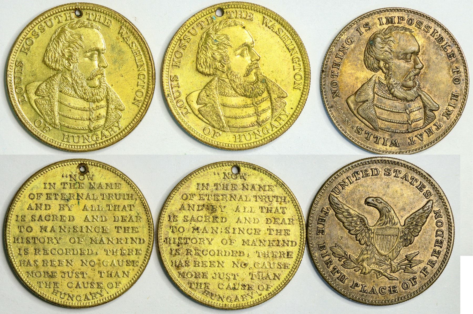 Three Louis Kossuth of Hungry US gaming token and medal, ca. 1860-61. The bright brass, thick “the Washington of Hungary” medal is holed as issued. One is near “Now” variety, the second is far “Now” variety. “Nothing is Impossible to Him That Wills” is a gaming token.