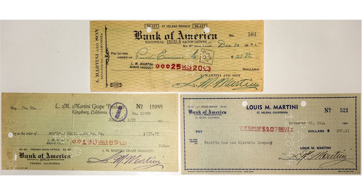 Lot of three checks signed by famous St. Helena winemaker Louis M. Martini. Dated 1935,1939, and 1944.