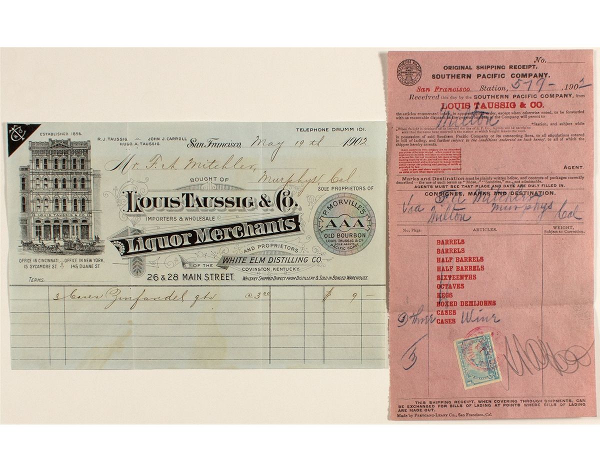 This particular shipment was for Zinfandel. Both pieces go together. The Taussig Co. became one of the largest wholesale outfits in the west, eventually expanding into Cincinnati (located at 15 Sycamore St.) and New York City (at 9 Delancy St.) and were proprietors of the White Elm Distilling Co. in Covington, KY. Louis Taussig ceded control to Gabriel Taussig in the 1880's but the family continued operations up until Prohibition.City: San FranciscoCounty: San FranciscoState: CADate:
