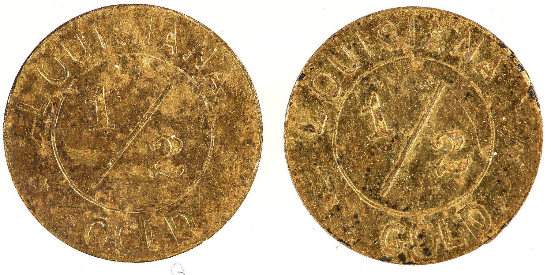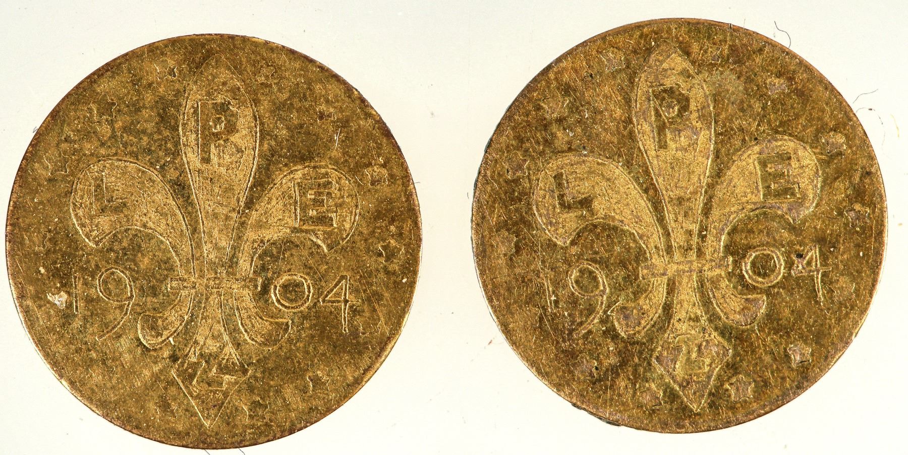 Two examples of the Saint Louis World's Fair of 1904 Louisiana Exposition gold. Obverse: Fleur de Lis; Lettering: 1904; Reverse: Louisiana / 1/2 / Gold. 11 mm; 0.3 grams each. AU-BU condition.