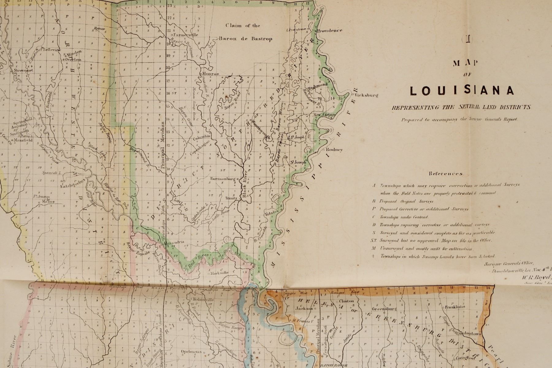 The 1837 suite consists of three maps: the Southwestern district 12 x 16"; the St Helena District 5 x 9"; the Southeastern District 8.5 x 12"; and the Cherokee Cession in Alabama 9.5 x 6". At the time, Louisiana was relatively new to the United States having been acquired from France in 1803 and became a state in 1812. On the 1837 suite, no surveyor is shown, nor any towns. The survey of the state was in its very infancy.