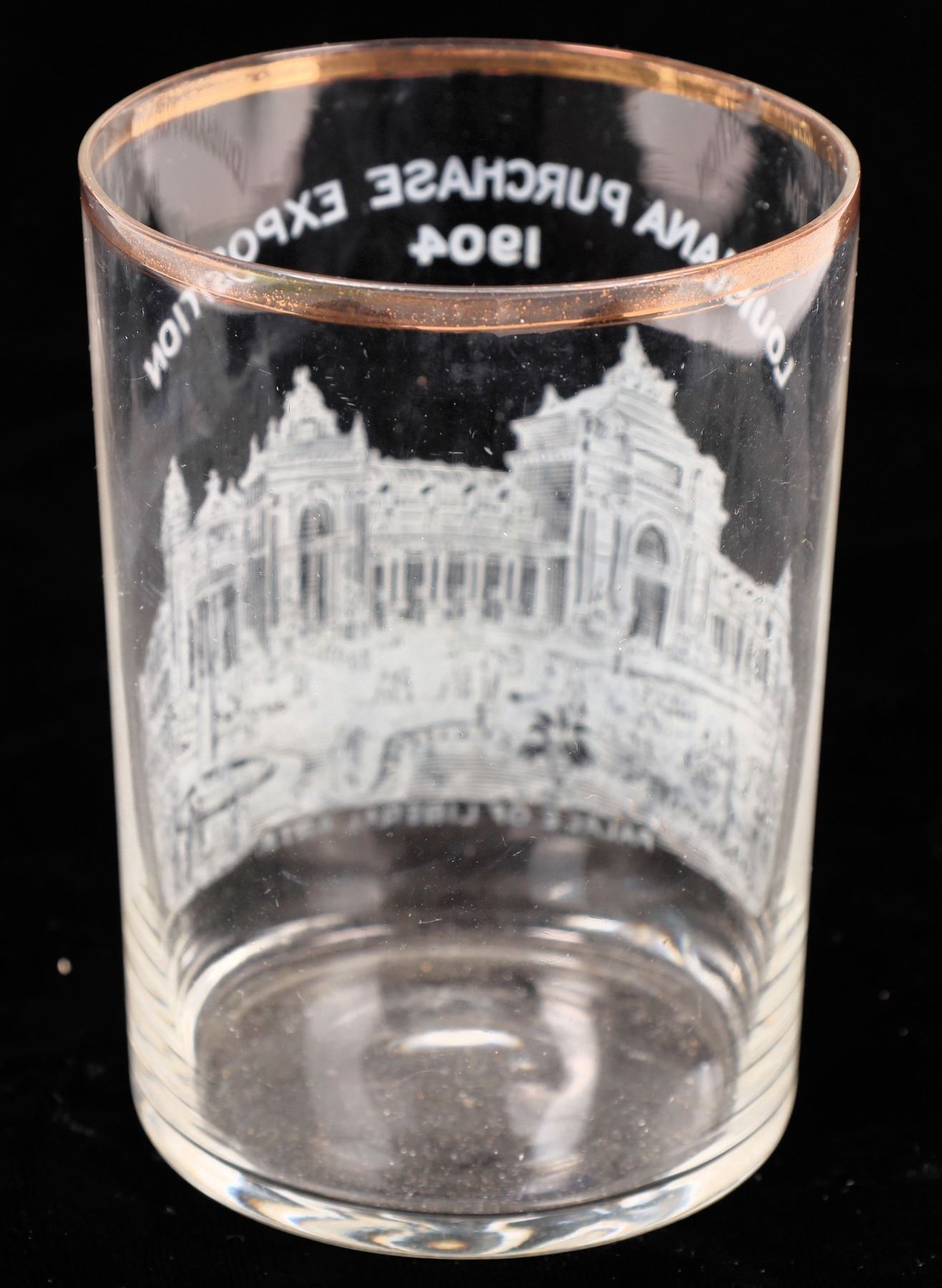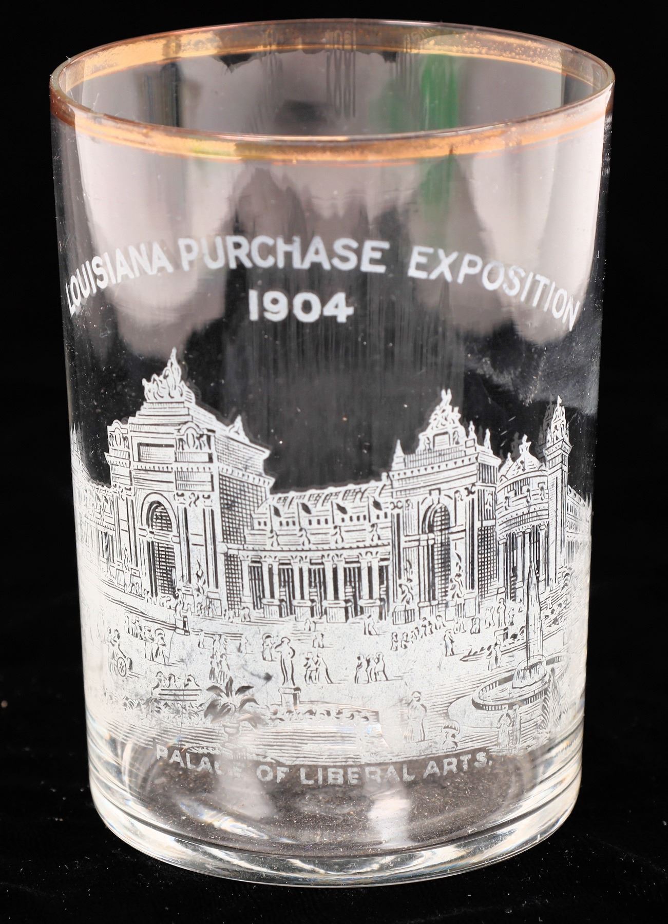 Thin wall gold gilt Louisiana Purchase Exposition/1904/Palace of Liberal Arts. 3.6". Small internal lip chip, some gilt wear. Missouri St. Louis