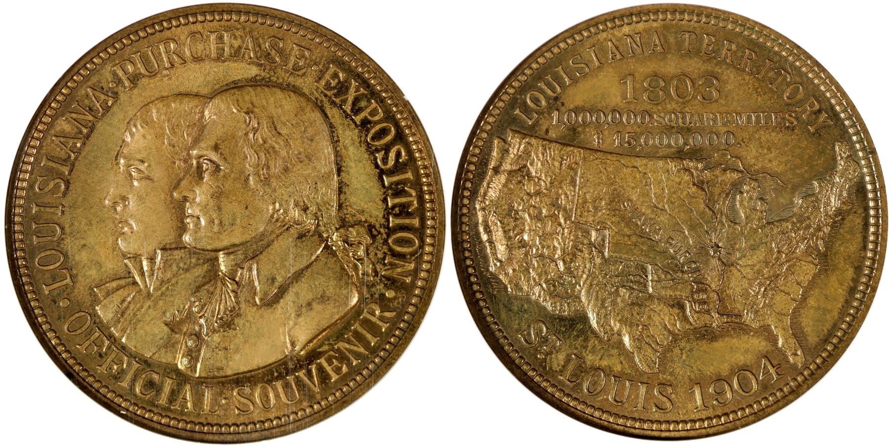 Photos courtesy of Tom Hoffman Obv: Conjoined busts l. (Napoleon & Jefferson); above, around • Louisiana • Purchase • Exposition •; below all Official • Souvenir •; beaded border. Rev: Relief map of U.S. with Louisiana Purchase across that portion representing extent of purchase; above Louisiana Territory / 1803 / 1,000,000 Square Miles / $15,000,000.; below map St. Louis 1904, beaded border. With star. HK-302 Yellow Bronze. NGC certified MS 63. R3.