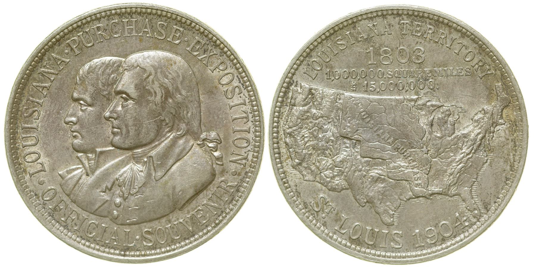 Silver example of HK 299. Obv.: Conjoined busts of Napoleon & Jefferson; Louisians / Purchas / Exposition / Official / Souvenir. Rev.: relief map of the U.S. with "Louisiana Purchase" across that portion representing the extent of the purchase. Above: Louisiana Territory / 1803 / 1,000,000 Square Miles / $15,000,000 / St, Louis / 1904. The silver is .600 fine. Piece is in almost uncirculated condition. HWAC# 51842 Date: 1904 Location: St. Louis, Missouri