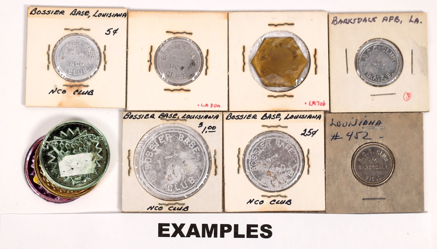 Lot of 17 pieces from Louisiana: Metairie YMCA swimming meet; 1977 Jefferson Parish St. Patricks Parade; 1984 Pete Fountain Mardi Gras medal Bossier Base NCO Club GF tokens (8). Mardi Gras tokens. Louisiana