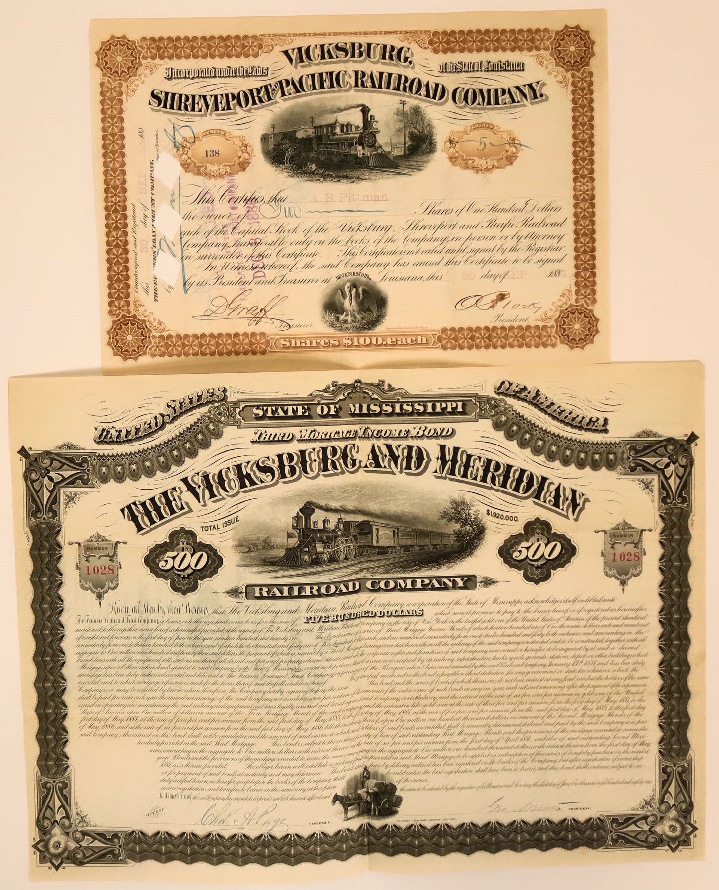 2 certificates. 1. The Vicksburg and Meridian Railroad Co. was the result of a reorganization on January 28, 1867, of the Southern Railroad of Mississippi. The V&M was reorganized in May 1889 as the Alabama & Vicksburg. #1028 of 1240, I/U, $500, no fixed %, Third Mortgage Income issued June 1, 1881. Signed illegible. Black, embossed seal w.train center, vignette top 4-4-0 Baltimore & Ohio locomotive.r-l. Bottom man w/horse cart full hat. American Bank Note Co. EF-AU 2. Vicksburg, Shreveport and Pacific Railroad Co.was chartered December 2, 1879, and ran until 1901 in Louisiana. #138, I/C, 5 shares @ $100 ea. issued Sept. 30, 1881 (date is stamped over dateline 188_). Brown, vignette top 4-4-0 American loco l-r, bottom state seal, American Bank Note Co. VF