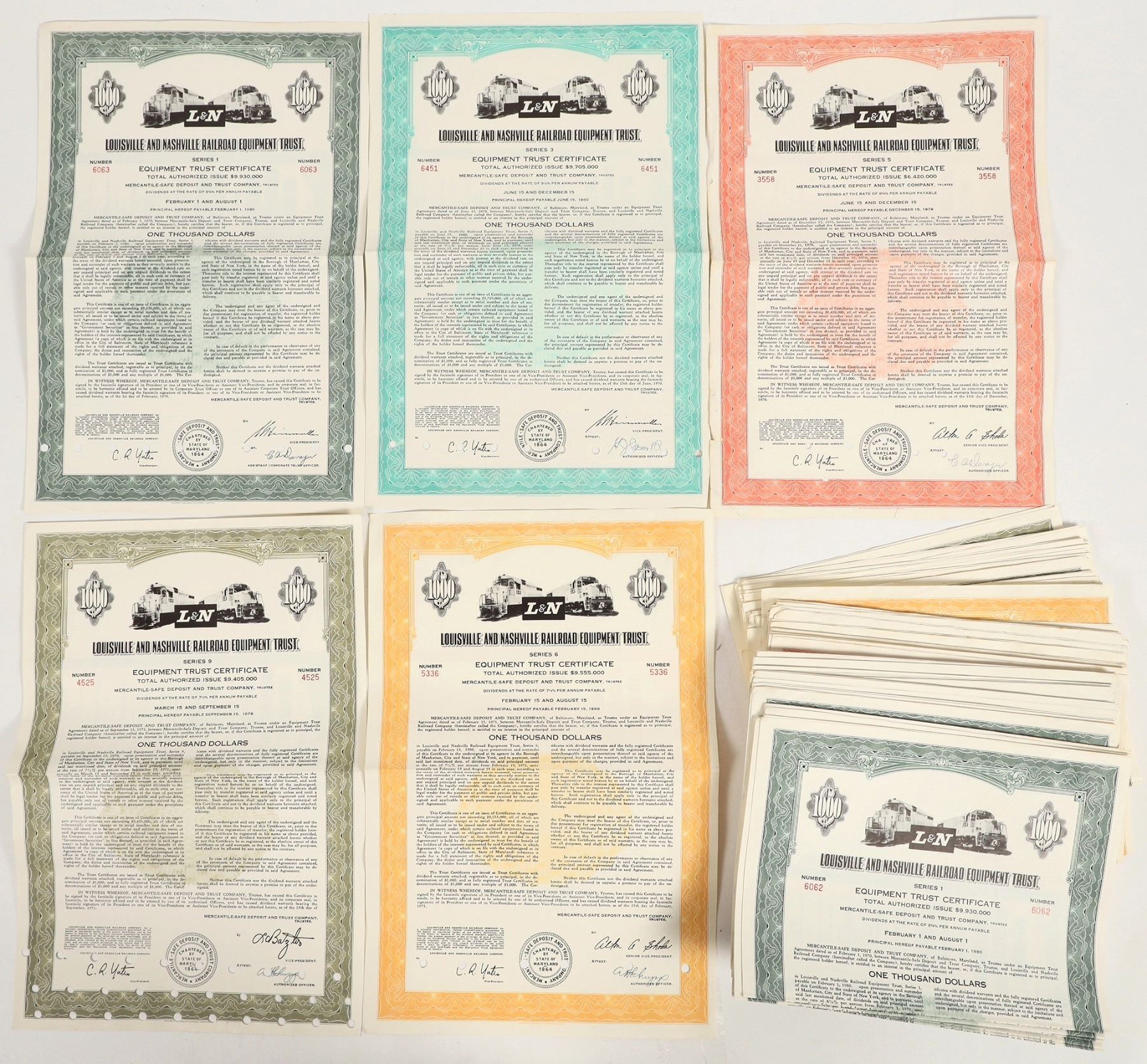 70+. I/C. Issued 1970-71. EF cond. Louisville And Nashville Railroad Equipment Trust certificates, $1000, 8 5/8%, four varieties. Security -Columbian BNC printer.