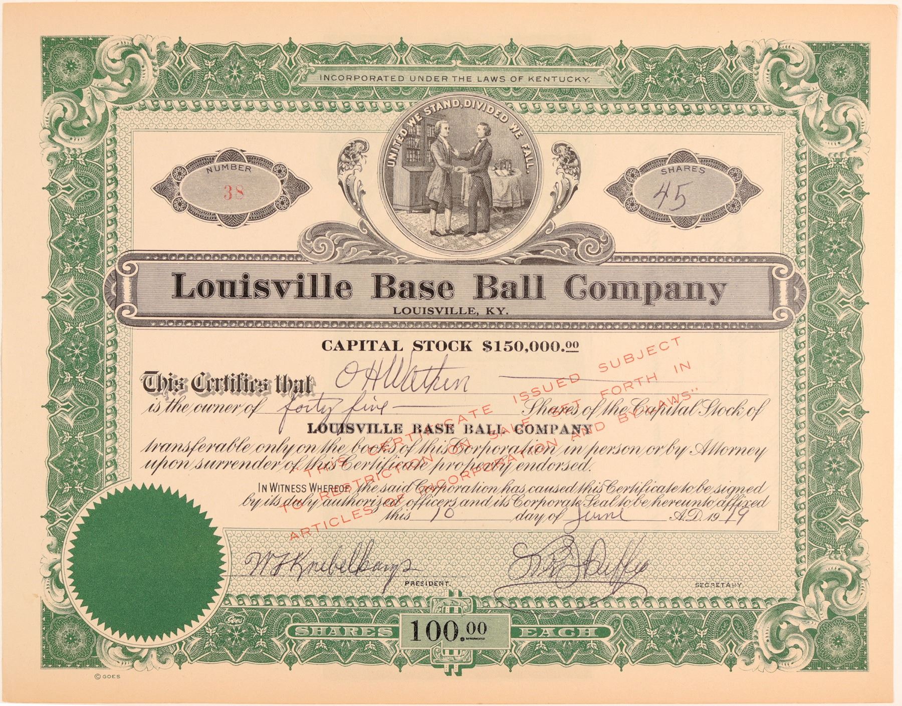 # 38 for 45 shares to OH Watken. Signed by Knebelbamp and Duffy. Green and black on white. Not cancelled. Shares were $100 each. In a couple of years a new stadium would be built for the Louisville Cardinals. This $4,500 most assuredly went to make that new stadium a reality. Top right corner tear. Excellent condition. Ken Prag Collection