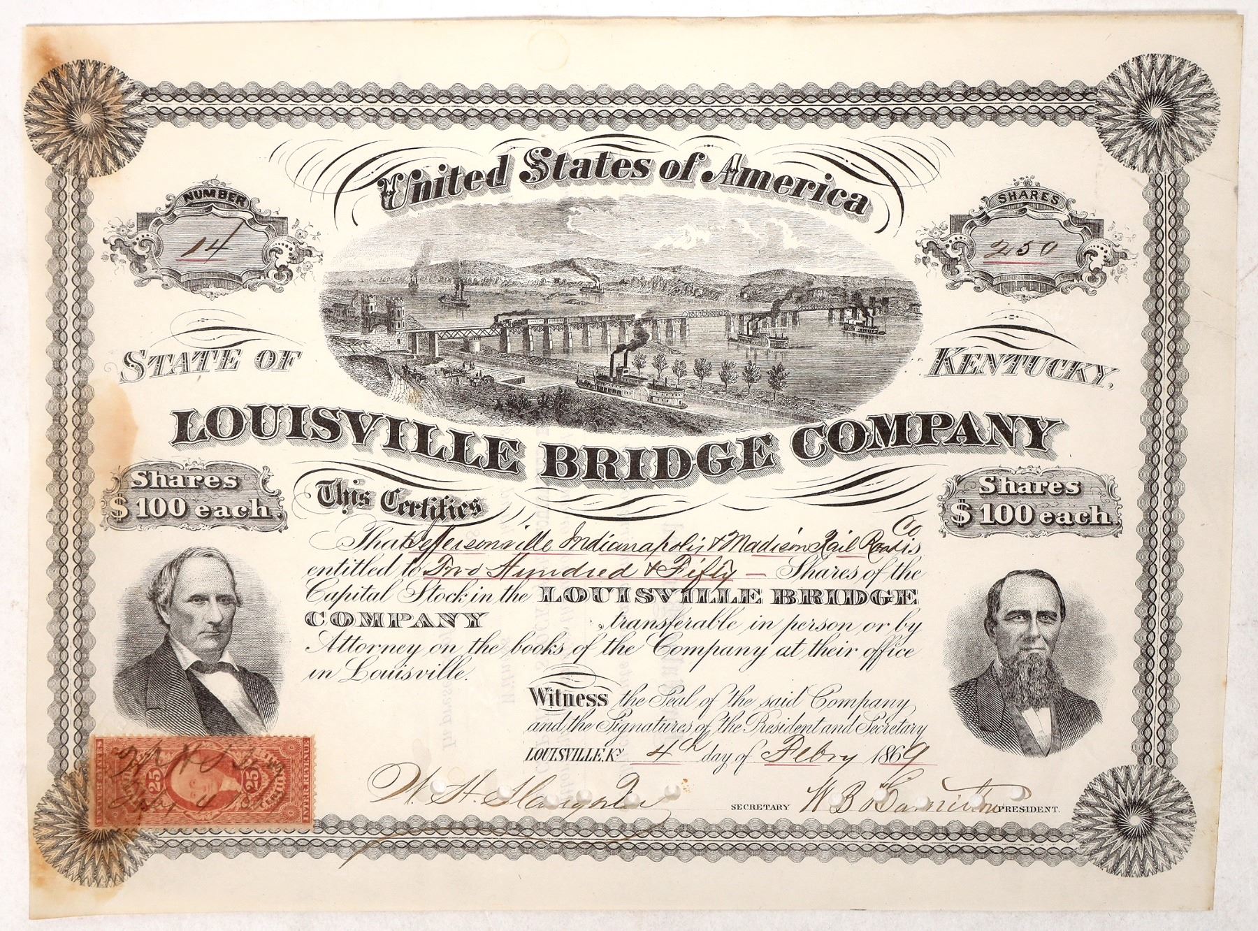 1869 Louisville Bridge Co. stock with great bridge vignette. 3 left side stains. Please inspect.