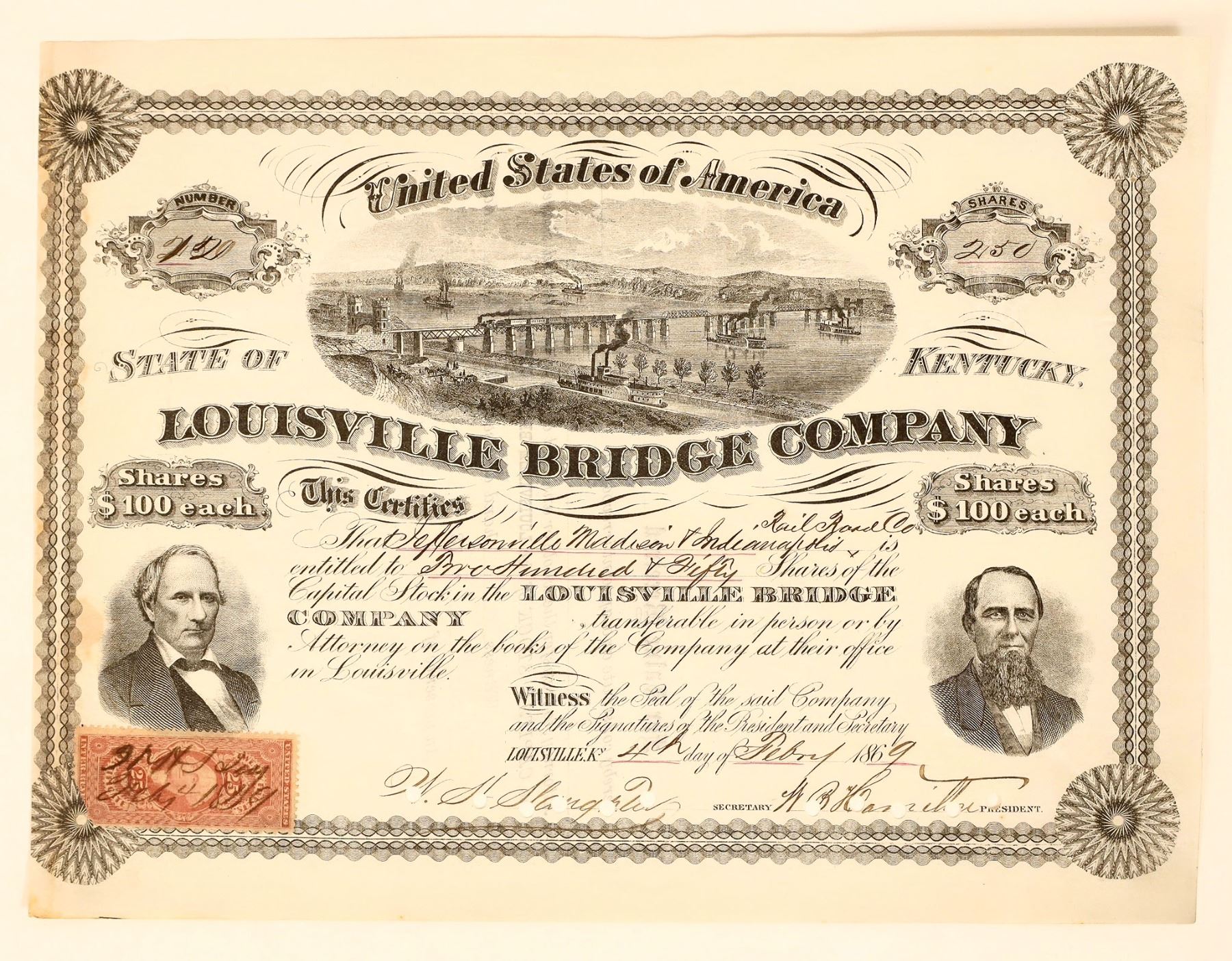 Issued 1869 Louisville Bridge Company stock. Large river vignette shows a long railroad bridge crossing the river and many steamers. The company built the 14th Street Bridge over the Ohio River connecting Louisville, Kentucky and Clarksville, Indiana. 25c adhesive revenue stamp.