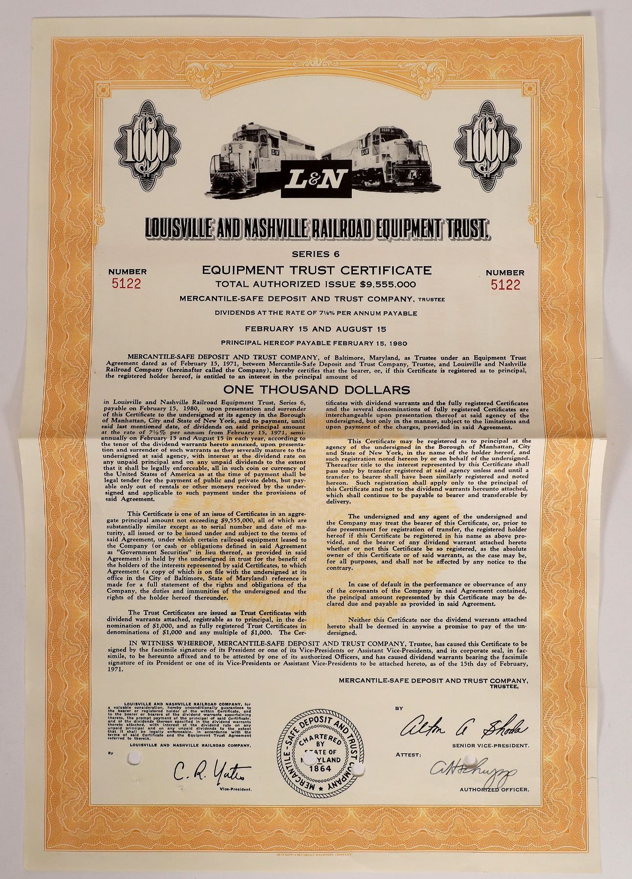 Louisville and Nashville Railroad Equipment Trust, Bond, Incorp Maryland 1864, $1,000, #5122, Mercantile-Safe Deposit, 1971, signed by Alton A. Shoda as senior vice-president and C.R. Yates as vice-president, 15x10", i/c, 1 cert