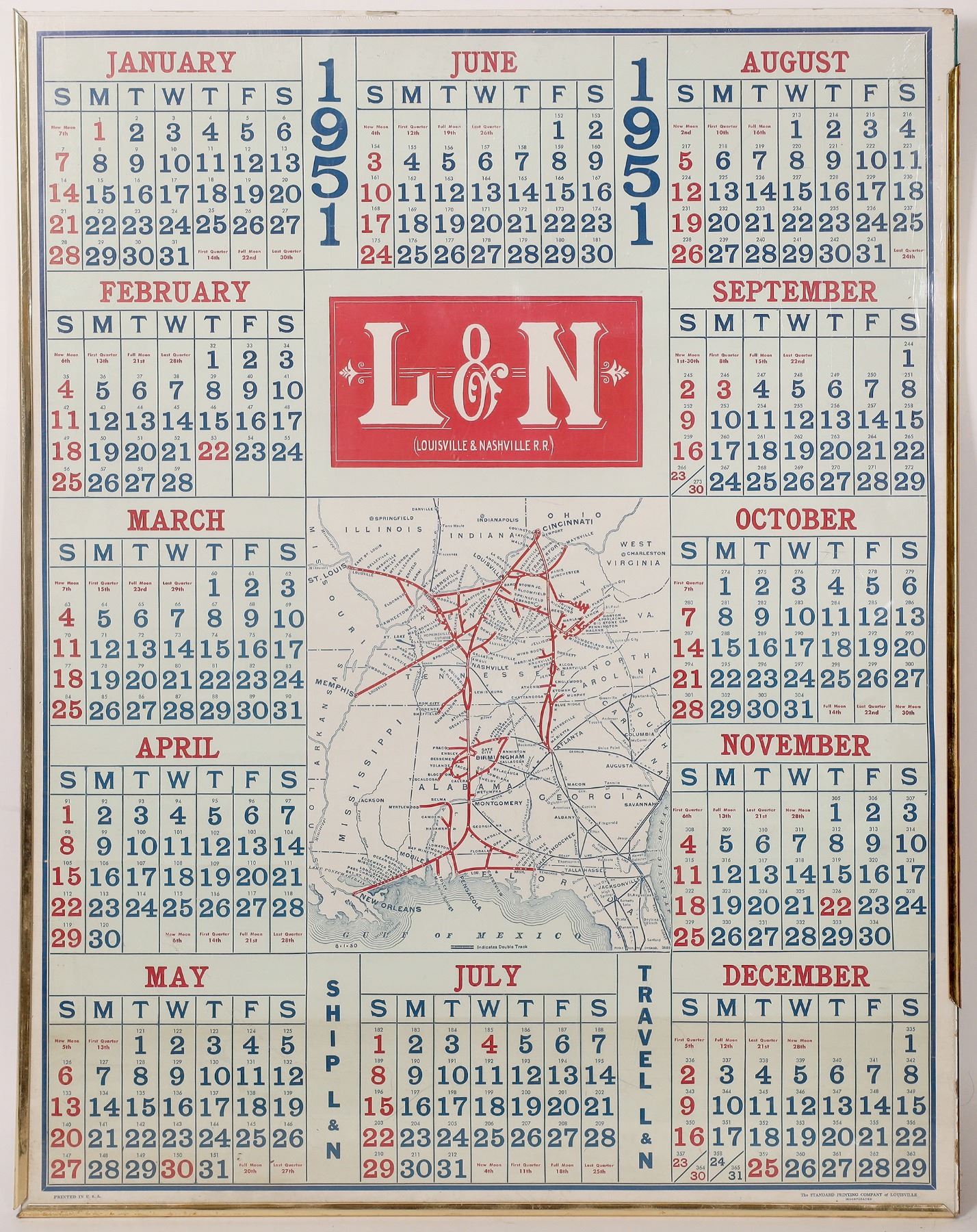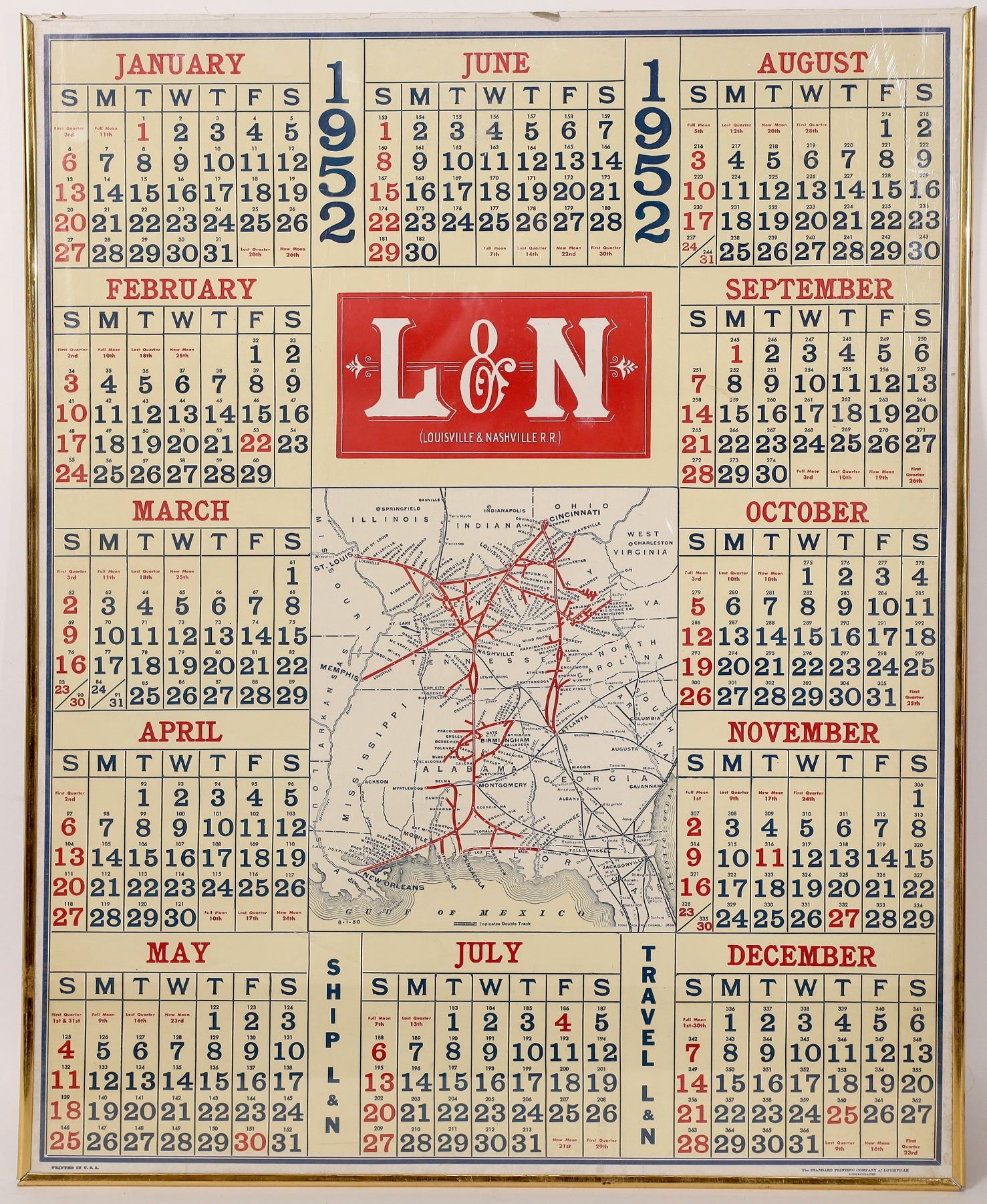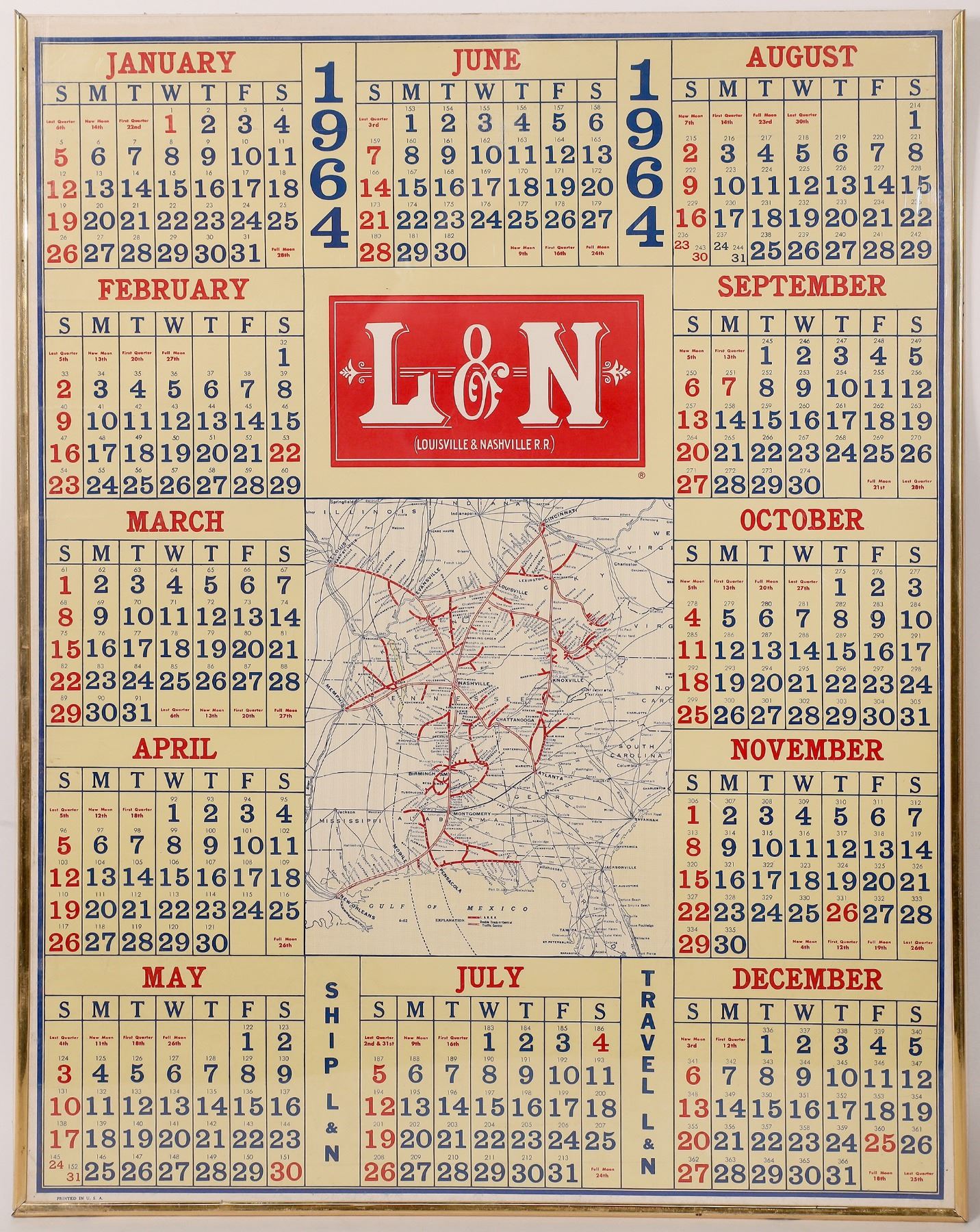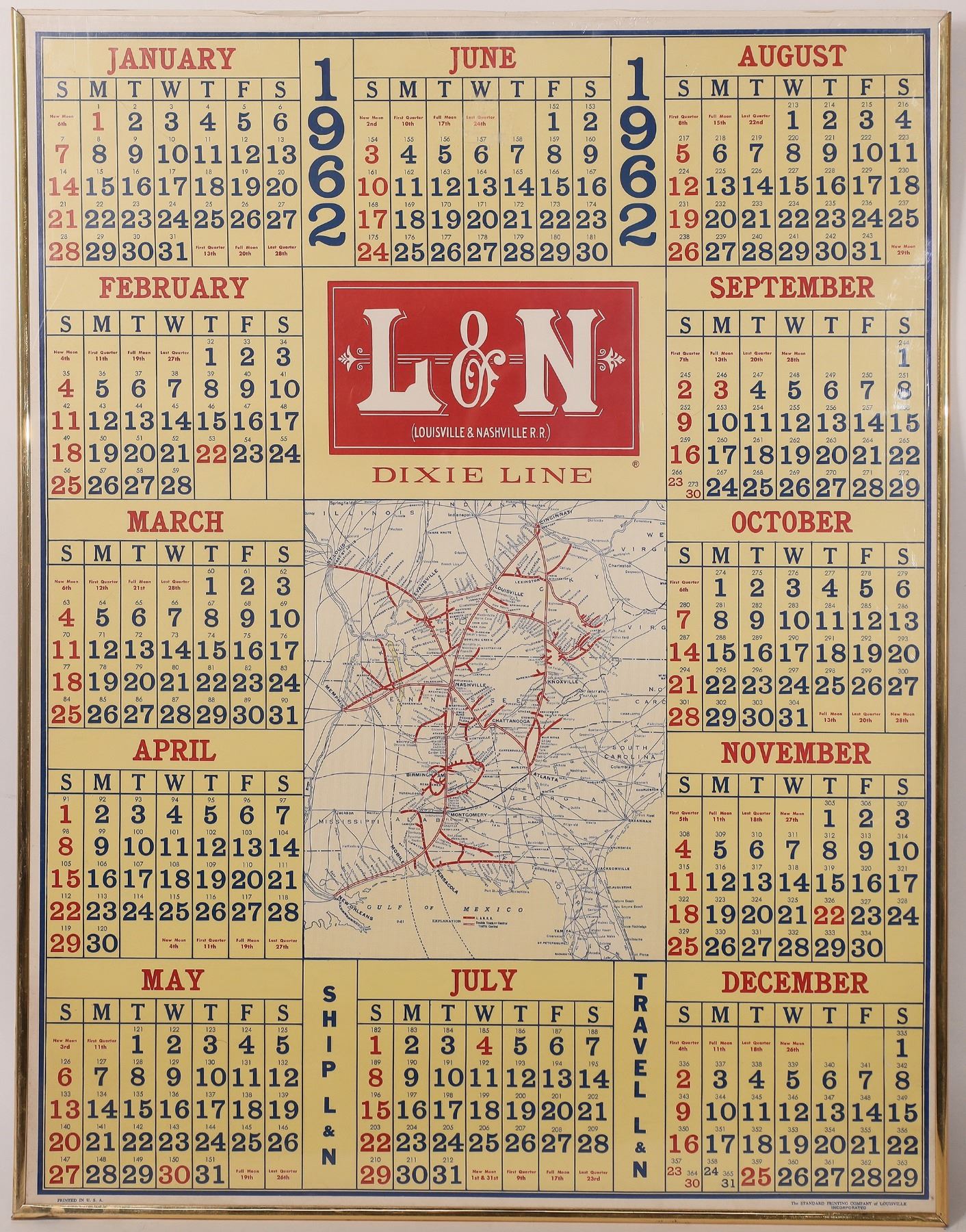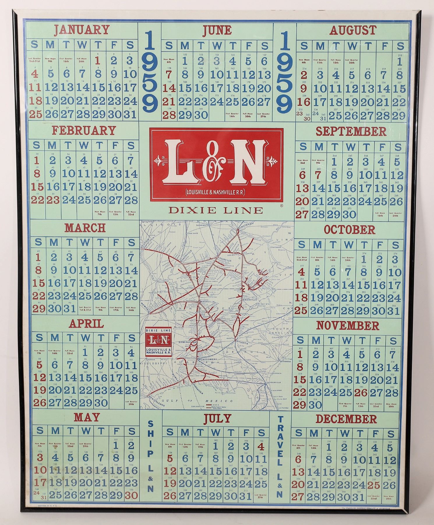 14 large L & N Railroad poster calendars, each with a map of the routes, circa late 1940s-1960s. Overall size 22 x 28, each with crude plastic frames. Each poster at least two different colors printed by the Standard Printing Company of Louisville. Kentucky