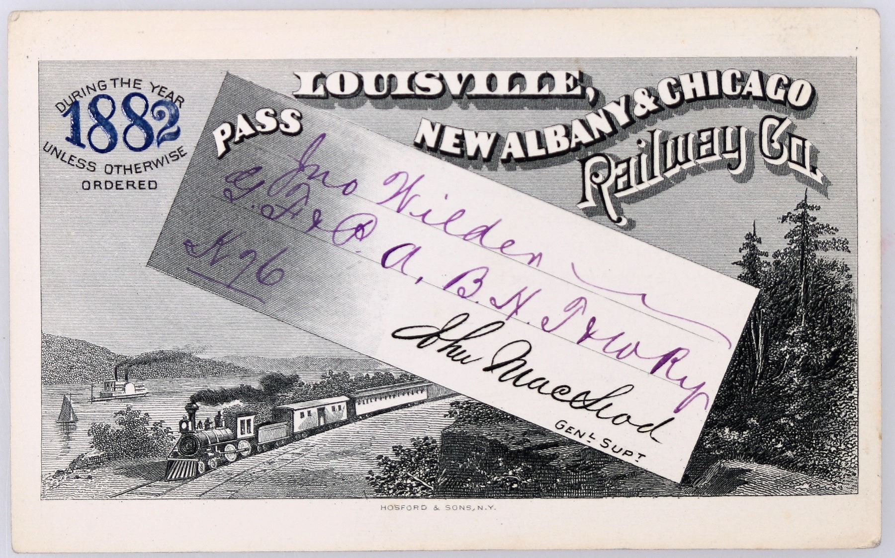Gorgeous pass issued for 1882 to John Wilden of the BHT&W Railway. Preprinted signature of general superintendent Macleod. Reverse is endorsed by WN Marshall. Full face illustrated design with locomotive moving past trees with ship in the background. Printed by Hosford & Sons. Nice condition. This was an 1873 reorganization of the Louisville, New Albany and Chicago Railroad (LNA&C), which was a reorganization of the New Albany and Salem Railroad founded in 1847. Operated in Indiana, Illinois, and Kentucky. Later became the Monon Railroad.