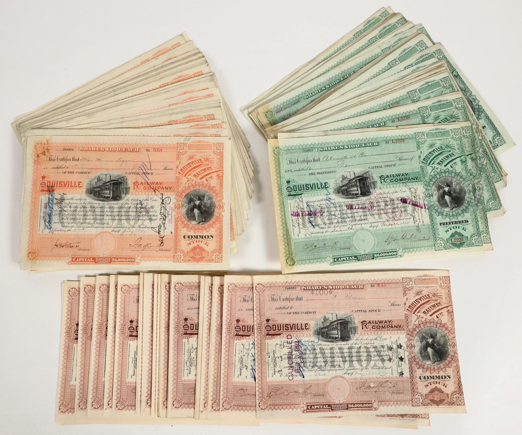 This group of stocks were issued by the Louisville Railway Co. between 1893-1897, over 200 stocks in all. There are about 25 preferred stocks unissued, about 30 preferred stocks issued, and about 150 common stocks issued. Please see photo for details.