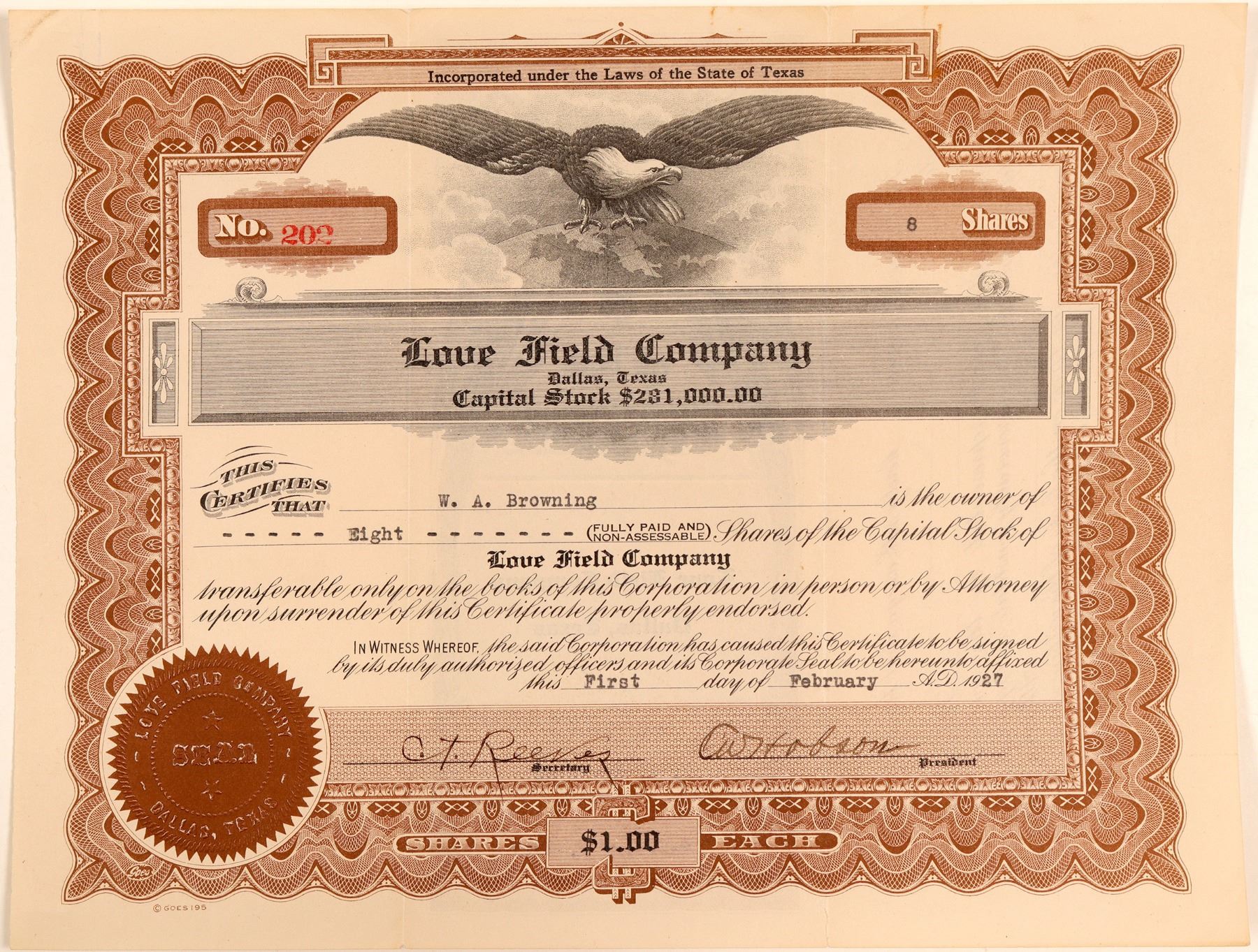 Inc. in Texas. No. 202, issued for 8 shares to W.A. Browning on Feb. 1st, 1927. Signed by president Hobson and secretary CT Reeves. Not cancelled. Brown border and seal, black print, eagle on globe vignette. Heavy folds, toning, paperclip indent. 8.25 x 10.5" Comes with historical info. Constructed in 1917. Named after First Lt. Moss Lee Love, 11th. Calvary, killed in an airplane crash in San Diego. Located 6 miles northwest of downtown Dallas. It was Dallas' main airport until 1974 when Dallas/Fort Worth International Airport (DFW) opened. Ken Prag Collection