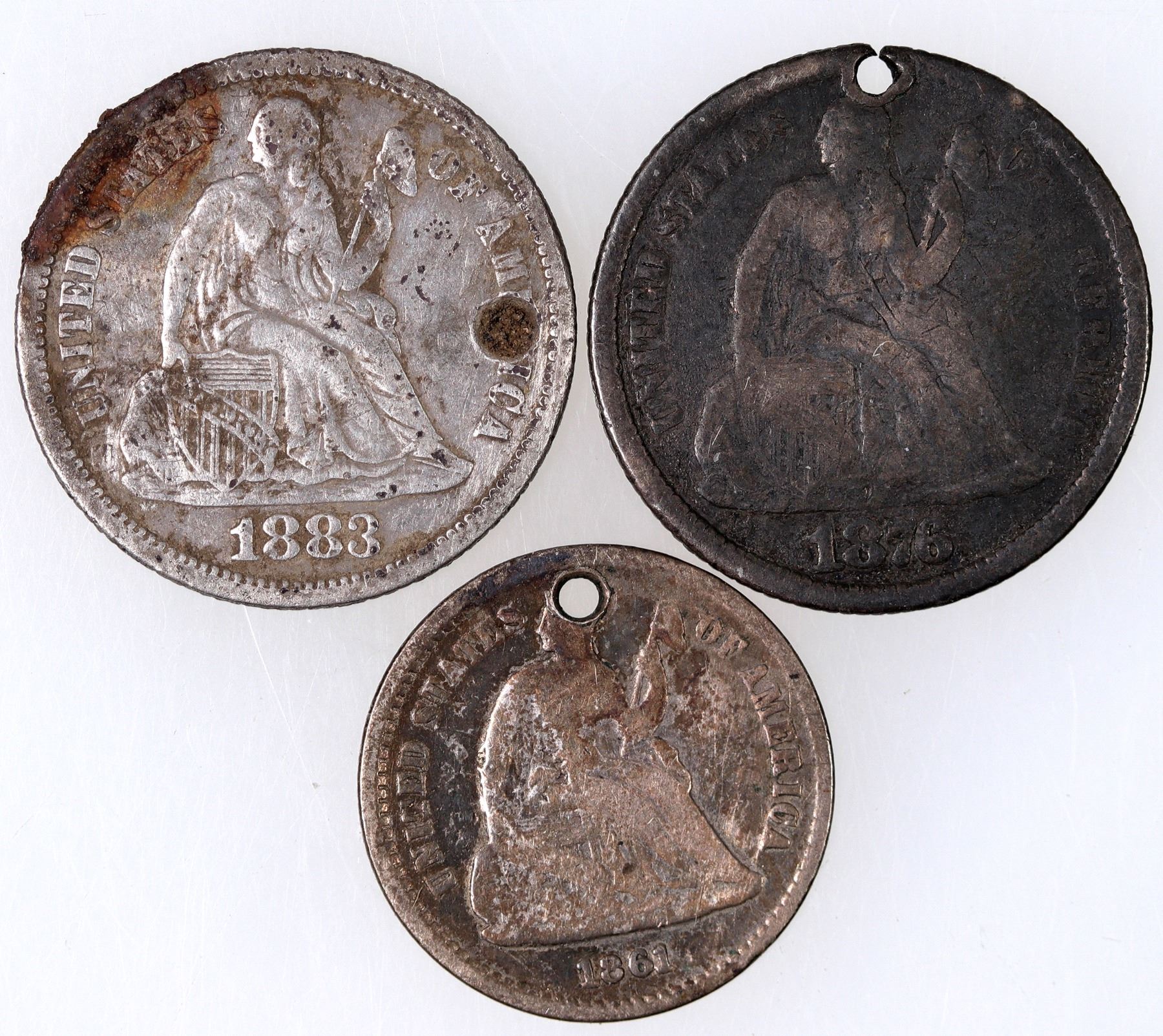 Lot of three love tokens: 1) 1876 Liberty Seated Dime, holed, reverse engraved "M/ W" intertwined. 2) 1861 Liberty Seated half dime, holed ; reverse engraved "M a". 3) 1883 Liberty Seated Dime, holed; engraved reverse "A".