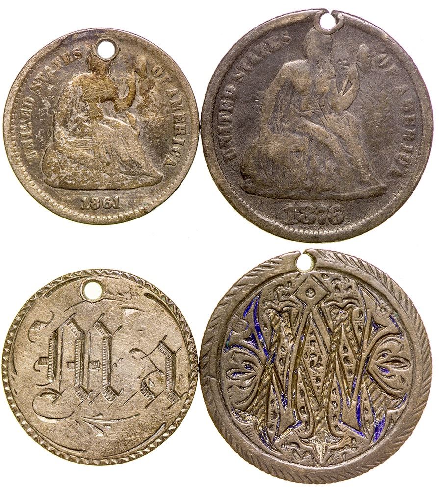 A pair of small "Love" tokens, both with tiny holes at the tops of the coins. Very small round pieces, 18mm and 15mm respectively. Interesting obverse and reverse sides, both showing wear. Please inspect. City: State: United States Date: 1861-1863 hwac# 28279