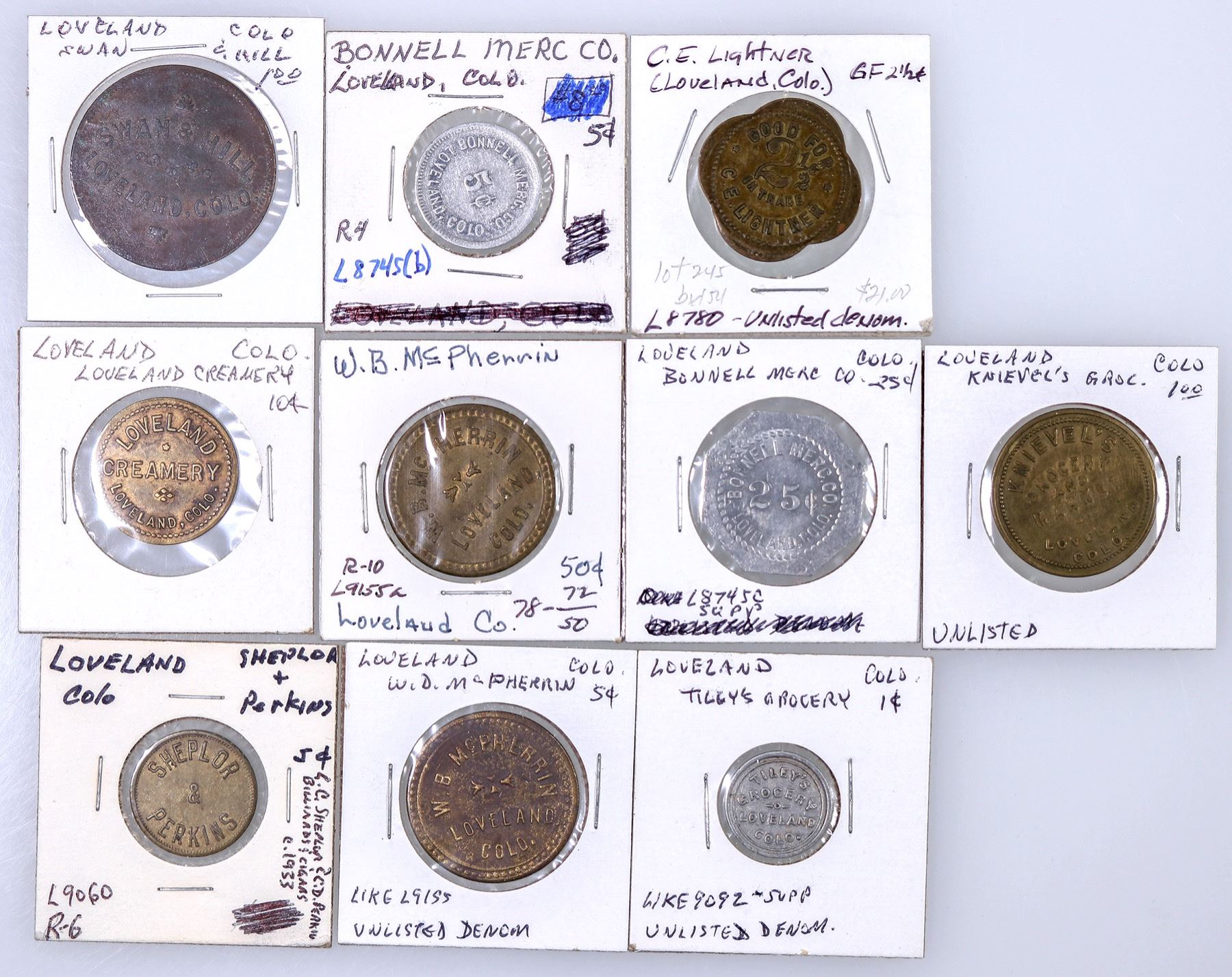 Lot of ten tokens from the Larimer County town of Loveland: Bonnell Merc. Co. (2); Knievel's Grocery; C. E. Lightner; Loveland Creamery; W. D. McPherrin (2); Tilley's Grocery; Swan & Hill.