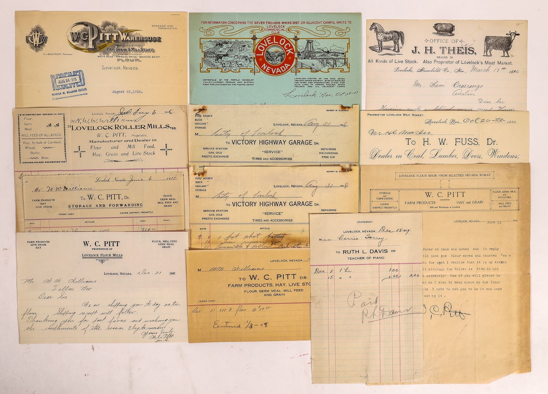 Lot of twelve. 1) JH Theis dealer in livestock. 1886. Vignettes of horse, pig and cattle. 2) Lovelock Commercial Club. Black, gold and red on blue paper. Proudly proclaims. for information concerning Seven Troughs Mining Dist. or adjacent camps. 3) WC Pitt Warehouse, 1916. Large gold swirl around WC Pitt. Many other Pitt pieces. He was the main business man and promoter around town in the very early 1900's. Two Victory Highway Garage; 1928 when Lovelock was on the Victory Highway. FW Fuss Coal and Lumber. Ruth Davis teacher of piano.
