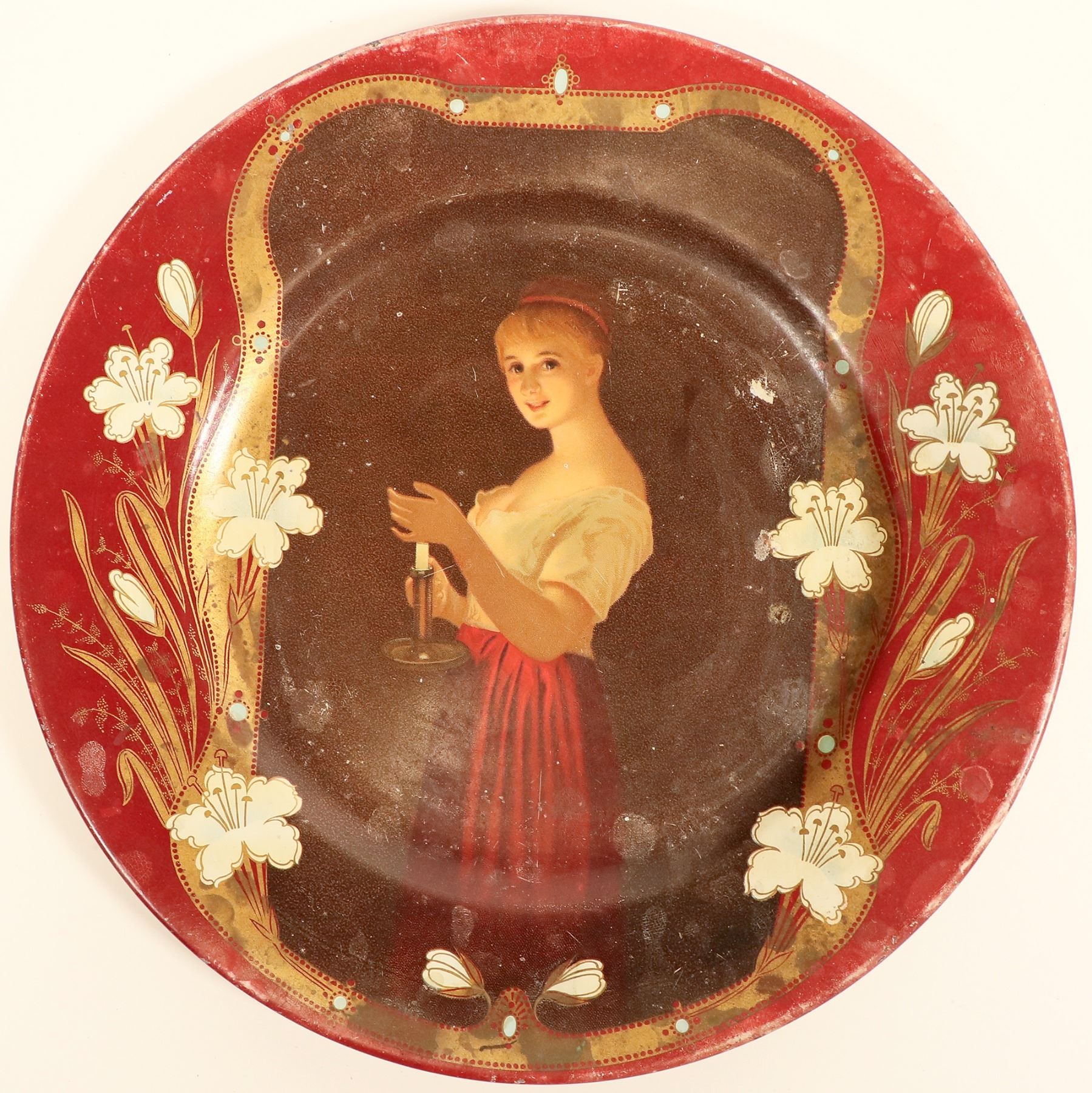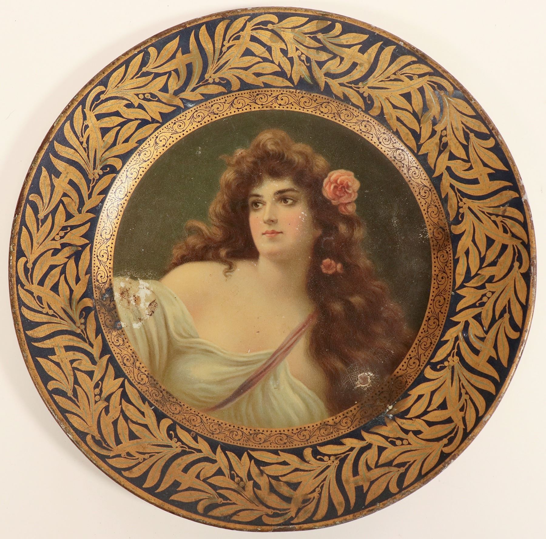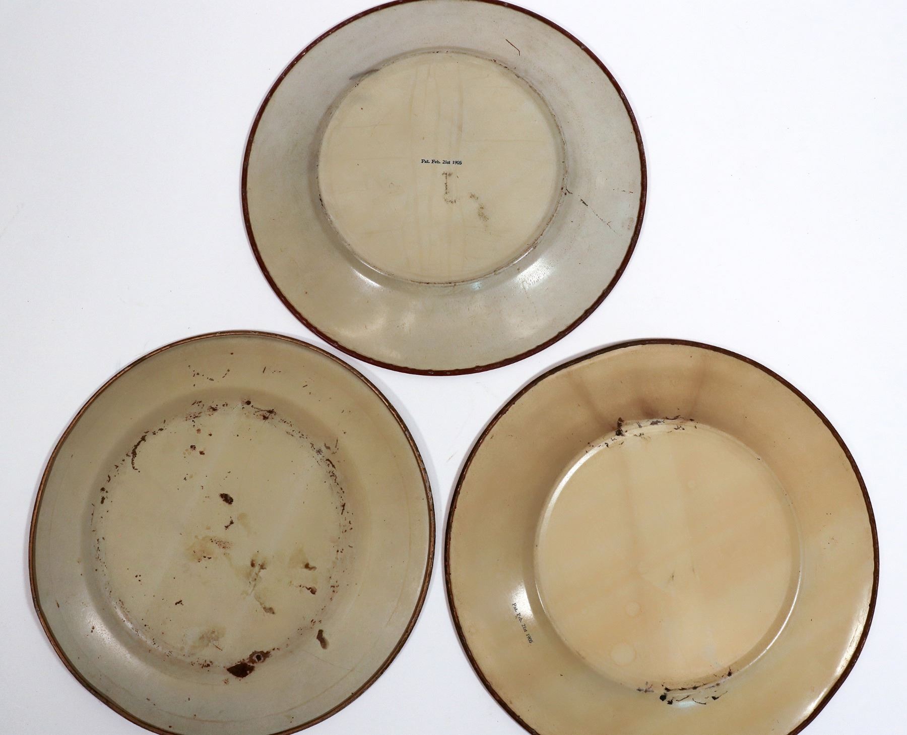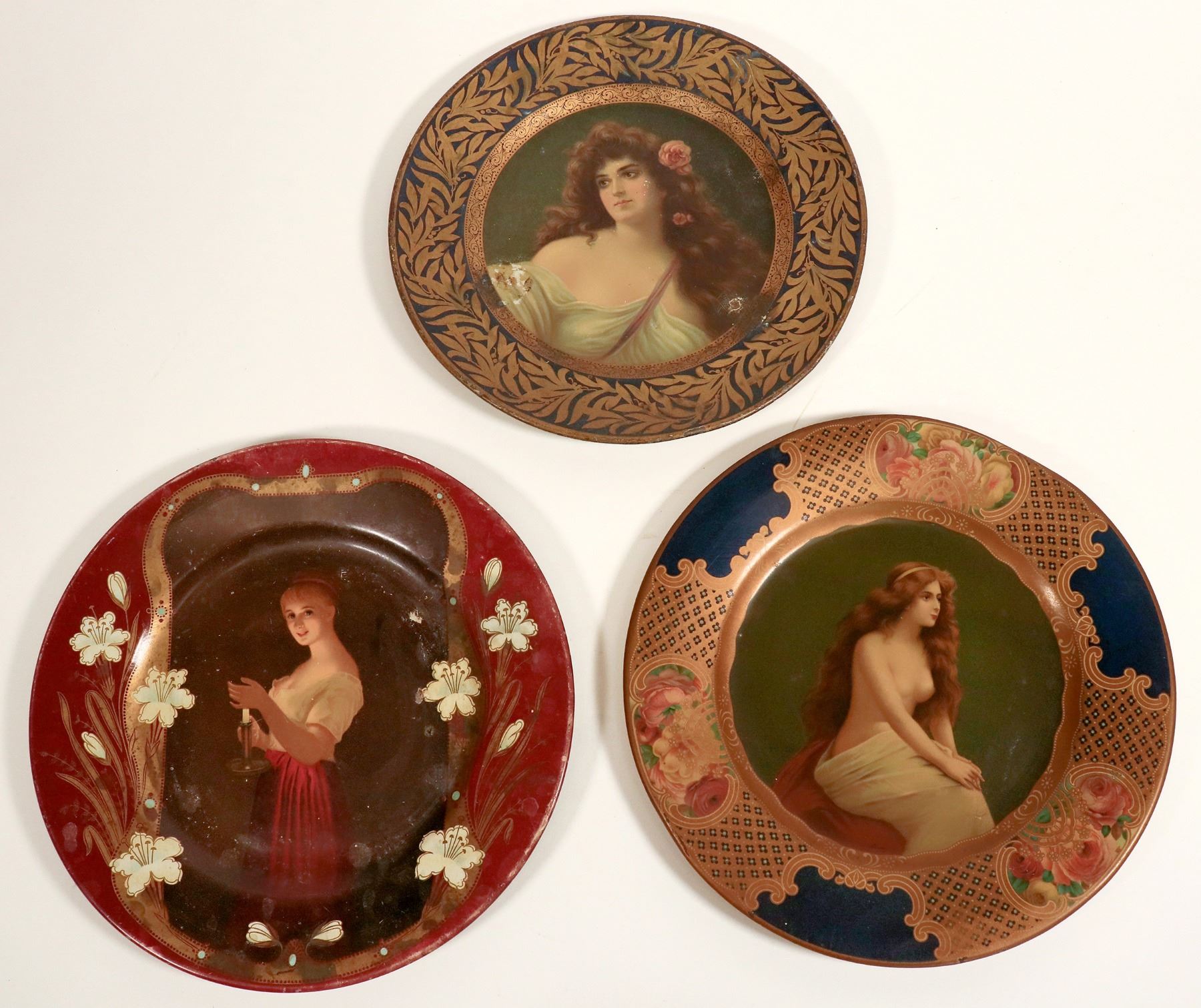 This are three round beer trays with three lovely ladies at 10 in. across. One glowing young lady, with surface wear patent date Feb. 21, 1905; one with flowing brown hair, surface wear; and one barely clothed woman with flowing brown hair in very good condition, curled edge patent date Feb. 21, 1905. C. 1910.