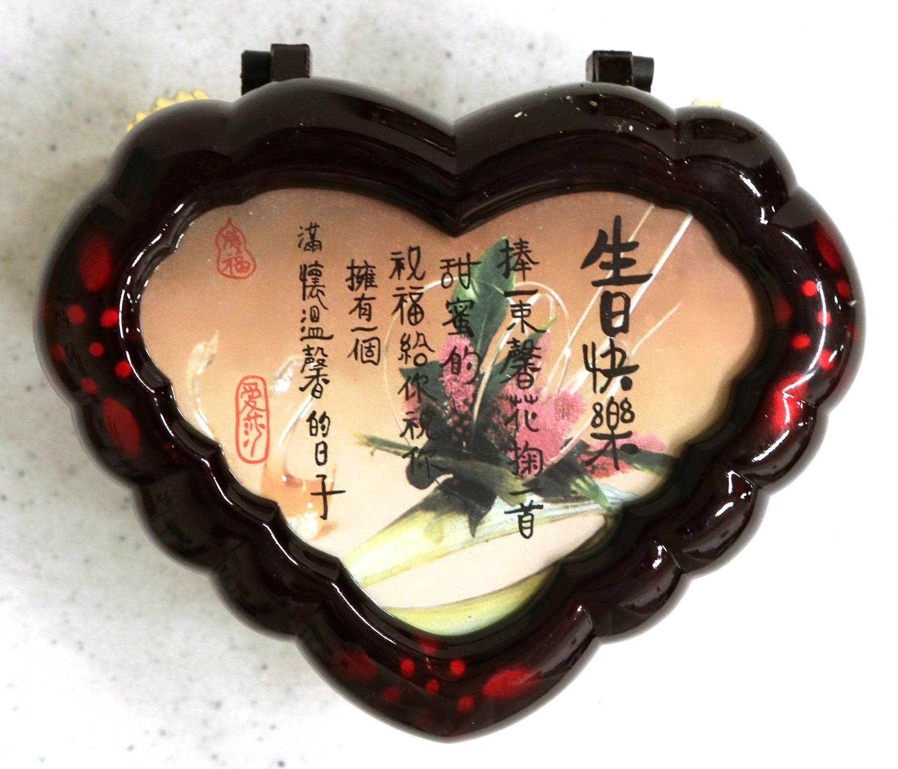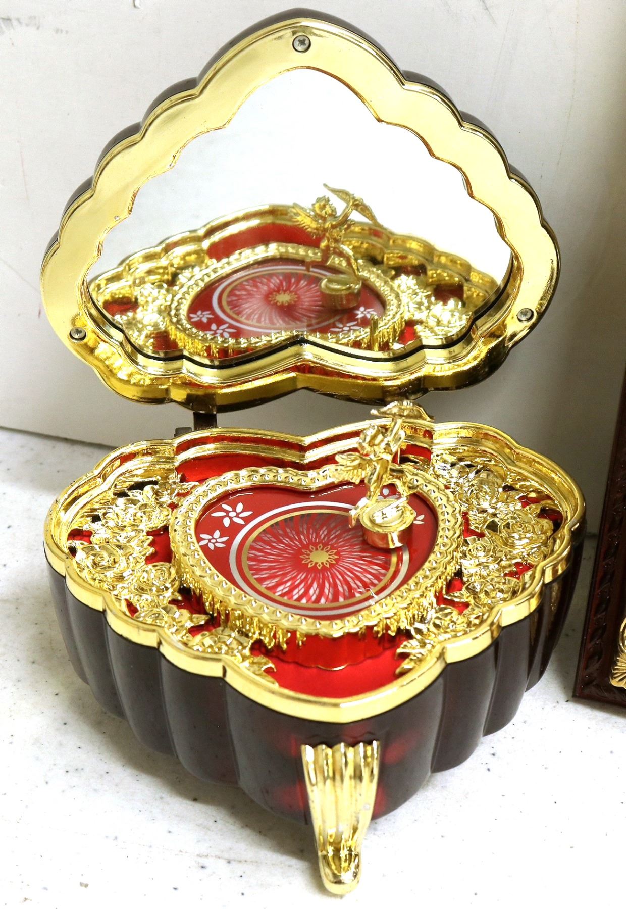 Dark glittering burgundy frames with gold color detailing. These frames light-up and take AA batteries (not included) and come with the image of Buddha installed. The frames measure approximately 9in by 11in (28cm by 23cm). The glass in the frame has holes strategically placed along the outline of the image to light the Buddha up. The jewelry boxes and music boxes are a matching burgundy color. The heart shaped music boxes wind up to play Fur Elise with a dancing cupid attachment and can be unscrewed to install a photo that will be visible on the outside. The jewelry boxes have a heart shaped compartment where a photo can be installed and a single pull out drawer. The top of the jewelry box flips up to reveal a mirror and a protected compartment of fabric flowers.