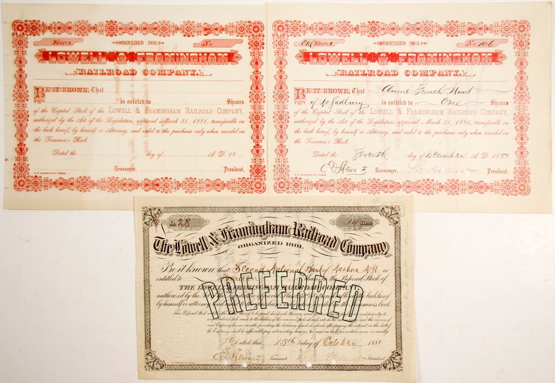 Unissued red. I/C red was unknown #106 Annie Hunt 1 share 1881 signed by President illegible. I/C black #28 14 shares 1881 signed by President illegible. "The Framingham and Lowell Railroad was a railroad in Middlesex County, Massachusetts. It was incorporated in 1870 to provide a rail connection between the growing railroad hub of Framingham and the important mill city of Lowell, passing through the towns of Sudbury, Concord, Acton, Carlisle, Westford and Chelmsford." from wikipedia. Ken Prag Collection