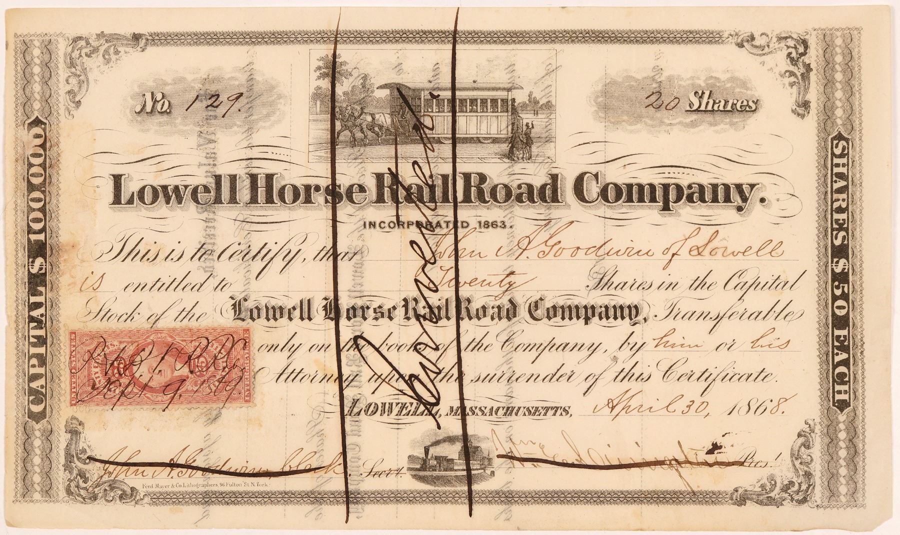 Cancelled 20 shares @ $50 each of Lowell Horse Rail Road Co. certificate # 129 issued to John A. Goodwin of Lowell on April 30, 1868. Inc. 1863. Signed by pres and secy. Black border. Adhesive RN stamp. Vignette: Top center of horse-drawn trolley car and bottom center steam engine train on tracks. Printed: Ferd Mayer & Co. Litho., 96 Fulton St., New York. In 1901 Lynn & Boston Railroad Co. bought Lowell’s streetcar lines. That was reorganized as the Boston & Northern Street Railway Co.