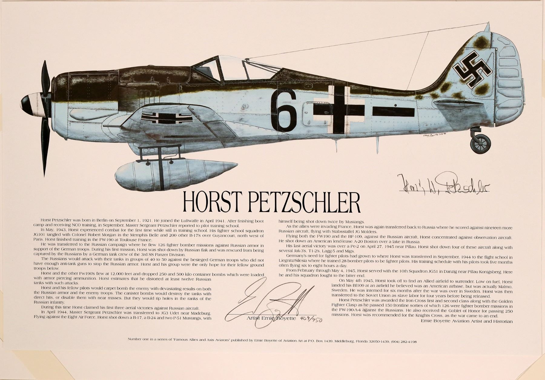 "Horst Petzschier" :This is the Bf-109G-6, "high altitude fighter" that was flown by Horst Petzschler. Horst flew two fighters painted exactly the same. Ernie Boyette S/N 409/750 Limited Edition Print. signed by pilot and artist. Biography below art work.