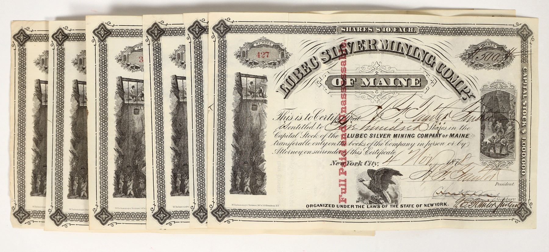 Lot of 6 uncancelled certificates, 1878, issued to JD Brewster and others with choice underground mining vignettes. According to the Boston Globe (Dec. 9th, 1878), this Eastport, Maine mining company had struck a rich vein of ore and had 100 tons on the surface from the 300 ft. level. They have 40 men employed who are installing more machinery. Ore is to be shipped to New York. The lead, zinc, and silver ore was assaying at 70% lead, 24 ounces of silver to the ton.