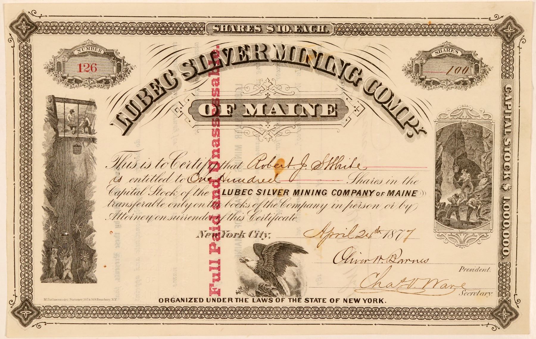 Cert. #126. Inc. in New York. Issued for 100 shares to Robert J. S. White and signed by Oliver Barnes as president and Chas. V. Ware as secretary. Issued in 1877, which is quite early for a Maine silver rush stock. Two nice mining vignettes at each side and an eagle at the bottom. Black on white. "Full Paid and Unassessable" in red vertically printed on the certificate. Thahuessinger Stationer, N.Y. printer. VF. Uncancelled.