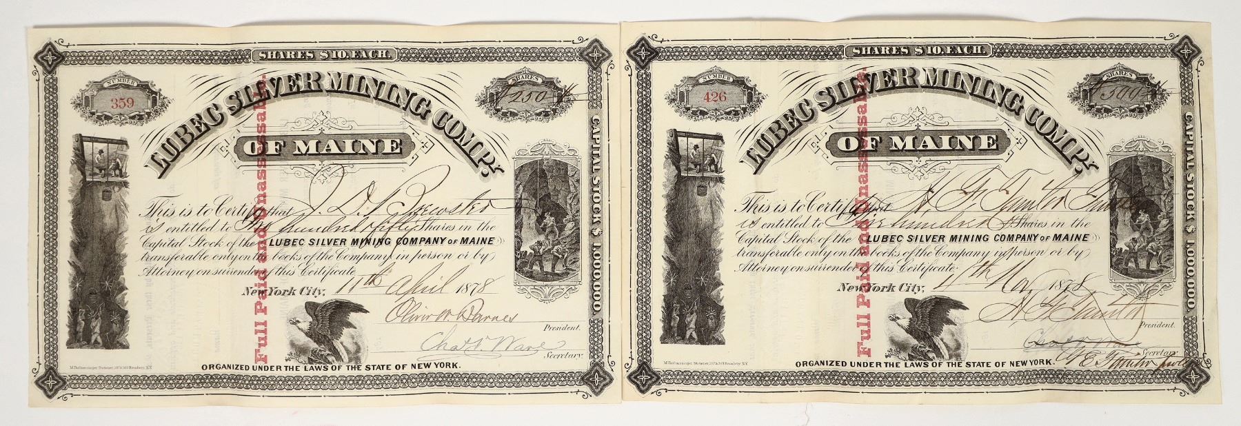 Lot of 2 issued in 1878 with two different presidents (Barnes and ?). Nice mining vignettes. According to the Boston Globe (Dec. 9th, 1878), this Eastport, Maine mining company had struck a rich vein of ore and had 100 tons on the surface from the 300 ft. level. They have 40 men employed who are installing more machinery. Ore is to be shipped to New York. The lead, zinc, and silver ore was assaying at 70% lead, 24 ounces of silver to the ton.