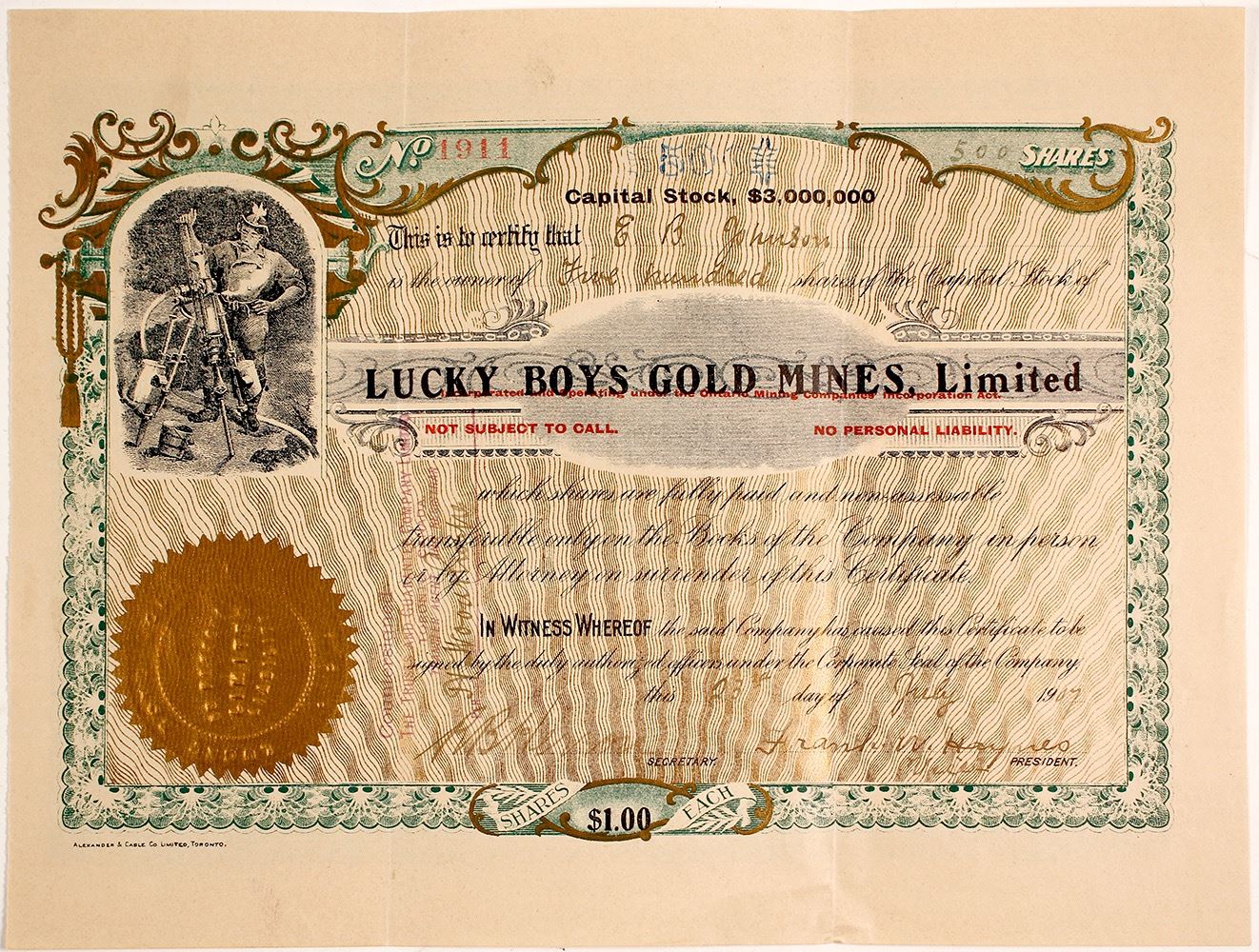 Choice green with gold over and under print. Issued 1907 #1911 500 shares. According to the Canadian Mines Register, the company had a gold claim in the Larder Lake area, Northern Ontario. Date: Location: zCanada HWAC# 56158