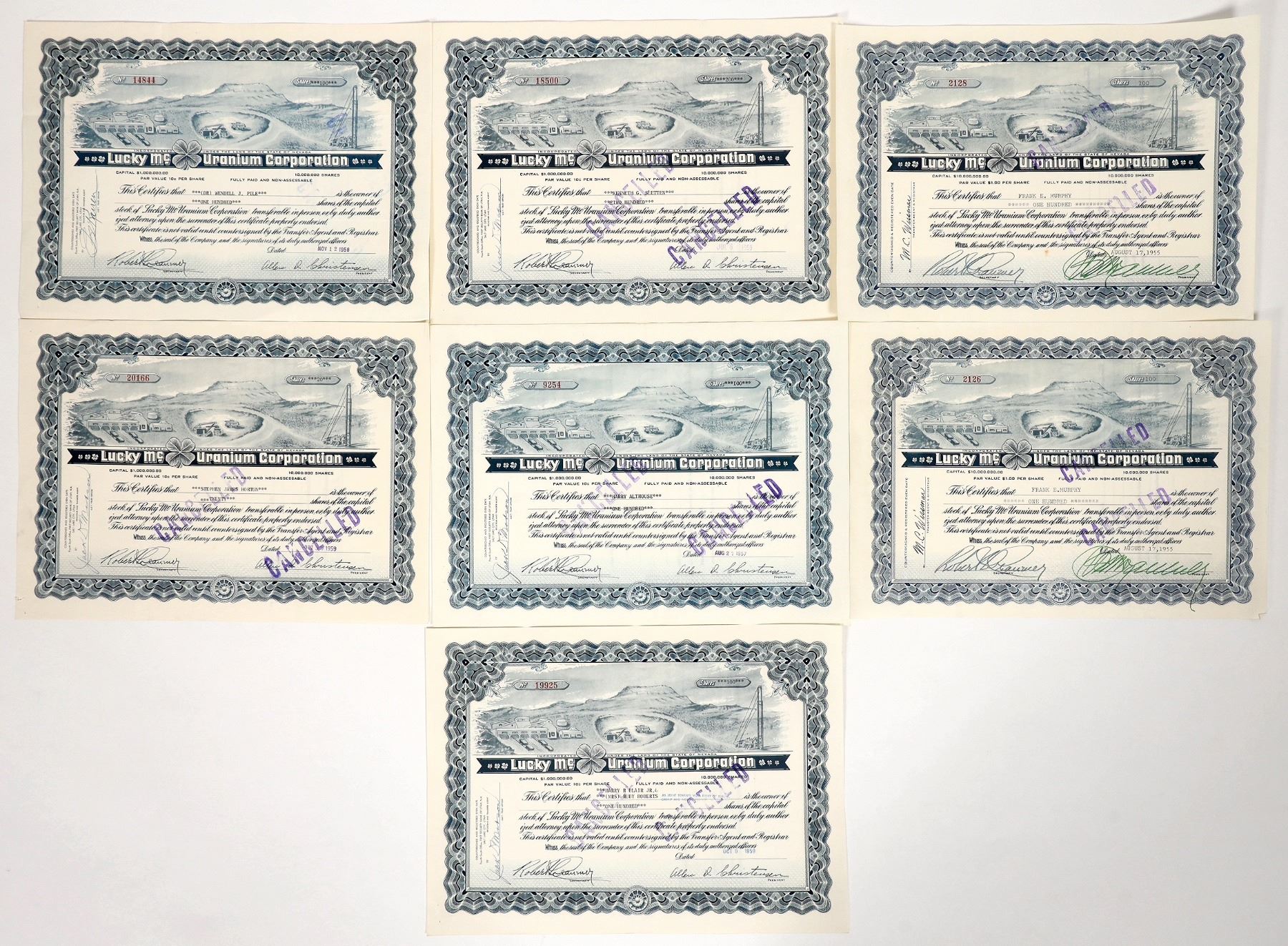 7x 1955-59 issued Lucky Mc Uranium stocks with large open pit vignette.